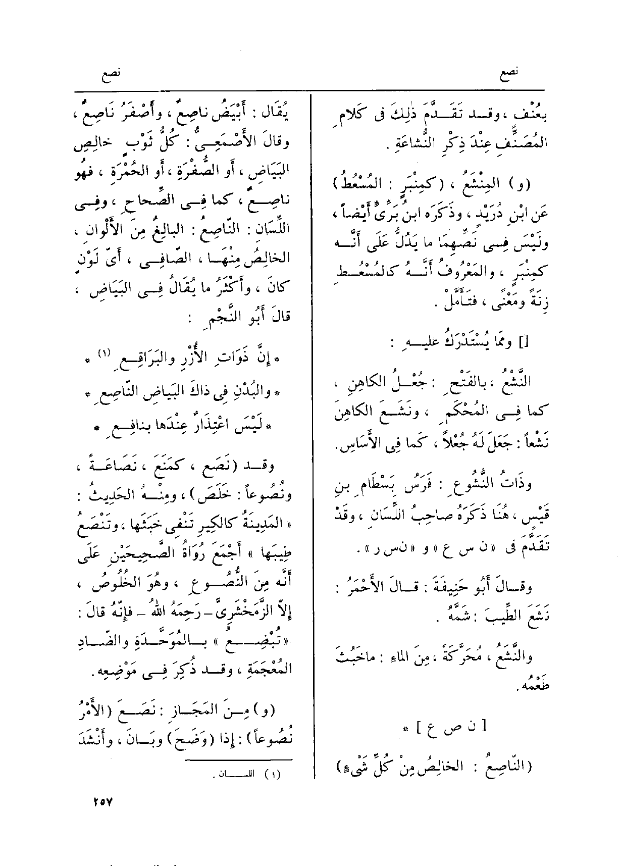 النّاصِعُ: الخالِصُ منْ كُلِّ شَيءٍ يُقَالُ: أبْيَضُ ناصِعٌ، وأصْفَرُ ناصِعٌ، وقالَ الأصْمَعِيُّ: كُلُّ ثَوْبٍ خالِصِ البَيَاضِ، أَو الصُّفْرَةِ، أَو الحُمْرَةِ، فهُو ناصِعٌ، كَمَا فِي الصِّحاحِ وَفِي اللِّسَانِ: النّاصِعُ البالِغُ منَ الألْوانِ، الخالِصُ منْهَا، الصّافِي: أيّ لَوْنٍ كانَ، وأكْثَرُ مَا يُقَالُ فِي البَيَاضِ، قالَ أَبُو النَّجْمِ: إنَّ ذَوَاتِ الأُرْزِ والبَرَاقِعِ والبُدْنِ فِي ذاكَ البَياضِ النّاصِعِ لَيْسَ اعْتِذَارٌ عِنْدَها بنافِعِ وَقد نَصَع، كمَنَعَ، نَصَاعَةً، ونُصُوعاً: خَلَصَ، ومنْهُ الحَدِيثُ: المَدِينَةُ كالكِير تَنْفِي خَبَثَها، وتَنْصَعُ طِيبَها، أجْمَعَ رُوَاةُ الصَّحِيحينِ على أنَّه من النُّصُوعِ، وهُوَ الخُلُوصُ، إِلَّا الزَّمَخْشَرِيَّ رحمَهُ اللهُ فإنّهُ قالَ: تُبْضِعُ بالمُوَحَّدَةِ والضّادِ المُعْجَمَة، وَقد ذُكِرَ فِي مَوْضِعِه.