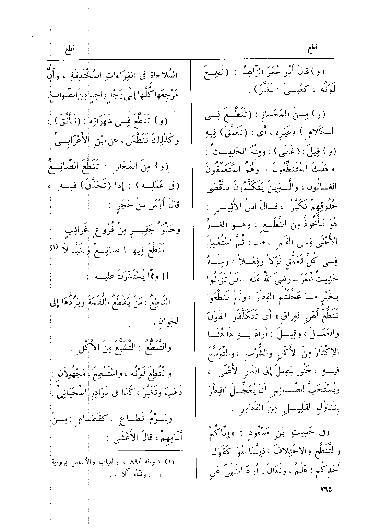 وَمن المَجَازِ: تَنَطَّعَ فِي الكَلامِ وغَيْرِه، أَي: تَعَمَّقَ فيهِ وقيلَ: غَالَى، ومنْهُ الحَديثُ: هَلَك المُتَنَطِّعُونَ وهُمُ المُتَعَمِّقُونَ الغالُون، والَّذينَ يتكَلَّمُونَ بأقْصَى حُلُوقِهِمْ تَكَبُّراً، قالَ ابنُ الأثِيرِ: هُوَ مأخُوذٌ من النِّطْعِ، وَهُوَ الغارُ الأعْلَى فِي الفَمِ، قَالَ: ثُمَّ استْعُمِلَ فِي كُلِّ تَعَمُّقٍ قَوْلاً وفِعْلاً ومنهُ حَديثُ عُمَرَ رضيَ اللهُ عَنهُ، لَنْ تَزَالُوا تَنَطُّهَ أهْلِ العِراقِ أَي تتَكَلَّفُوا القَوْلَ والعَمَلَ، وقيلَ: أرادَ بهِ هاهُنَا الإكْثَارَ منَ الأكْلِ والشُّرْبِ، والتَّوَسُّعَ فيهِ، حَتَّى يَصِلَ إِلَى الغَارِ الأعْلَى، ويُسْتَحَبُّ للصائِمِ أنّ يُعَجِّلَ الفِطْرَ بتَناوُلِ القَلِيلِ منَ الفَطُورِ.