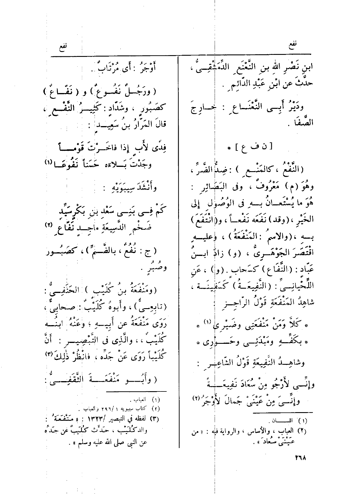 النَّفْعُ، كالمَنْعِ: ضِدُّ الضَّرِّ، وهُوَ م مَعْرُوفٌ وَفِي البَصَائِرِ: هُوَ مَا يُسْتَعانُ بهِ فِي الوُصُولِ إِلَى الخَيْرِ، وَقد نَفَعَه نَفْعاً، وانْتَفَعَ بهِ، والاسمُ: المَنْفَعَةُ، وعليهِ اقْتَصَرَ الجَوْهَرِيُّ وزادَ ابنُ عَبّادٍ: النَّفَاع كسَحابٍ. وعنِ اللِّحْيَانِيِّ: النَّفِيعَةُ كسَفِينَة، شاهِدُ المَنْفَعَةِ قَوْلُ الرّاجِزِ: كَلا ومَنْ مَنْفَعَتِي وضَيْرِي بكَفِّهِ ومَبْدَئِي وحَوْرِي وشاهِدُ النَّفِيعَةِ قَوْلُ الشّاعِرِ: