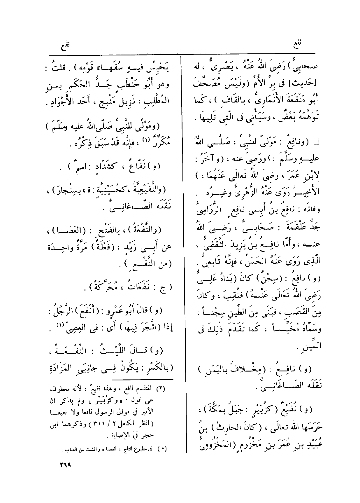 ونافِعٌ: مَوْلىً للنَّبِيِّ صلى الله عَلَيْهِ وَسلم ورَضِيَ اللهُ عَنهُ، وآخَرُ: لابِنْ عُمَرَ، رَضِي اللهُ تَعَالَى عنهُمَا، الأخِيرُ رَوَى عنْهُ الزُّهْرِيُّ وغيرُه.