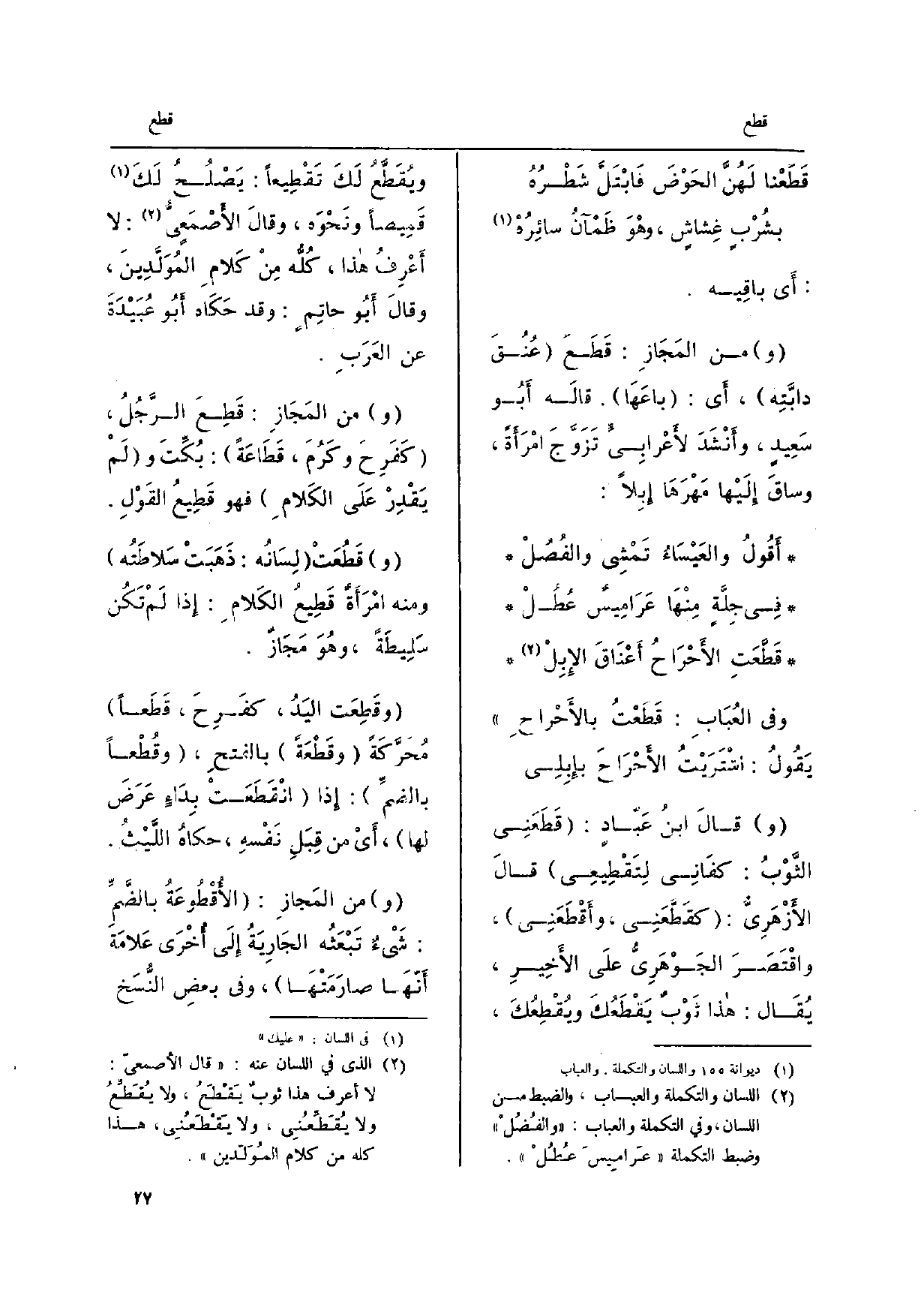 وقالَ ابنُ عَبّادٍ قَطَعَنِي الثَّوْبُ كفَانِي لِتَقْطِيعي قالَ الأزْهَرِيُّ: كقَطَّعَنِي، وأقْطَعَنِي، واقْتَصَرَ الجَوْهَرِيُّ على الأخِيرِ، يُقَال: هَذَا ثَوبٌ يَقْطَعُكَ ويُقْطِعُكَ، ويُقَطَّعُ لَكَ تَقْطِيعاً: يَصْلُحُ لَكَ قَمِيصاً ونَحْوَه، وقالَ الأصْمَعِيُّ: لَا أعْرِفُ هَذَا، كُلُّه منْ كَلامِ المُوَلَّدِينَ، وقالَ أَبُو حاتِمٍ: وَقد حَكَاه أَبُو عُبَيْدَةَ عَن العَرَبِ.