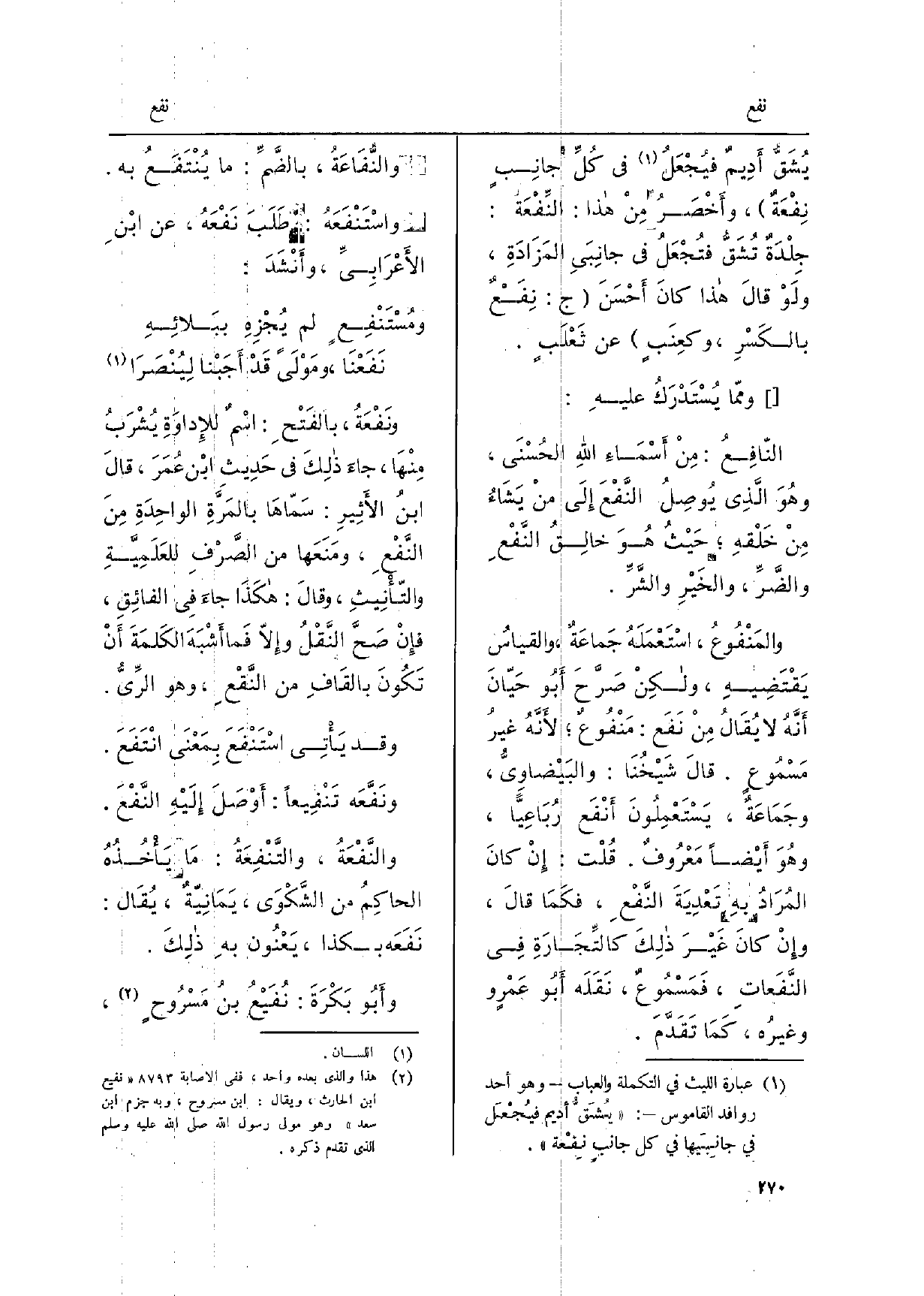 والمَنْفُوعُ، اسْتَعْمَلَهُ جَماعَةٌ، والقياسُ يَقْتَضِيهِ ولكنْ صَرَّحَ أَبُو حَيّانَ أنَّه لَا يُقَالُ منْ نَفَع: مَنْفُوعٌ، لأنَّه غيرُ مَسْمُوعٍ.)