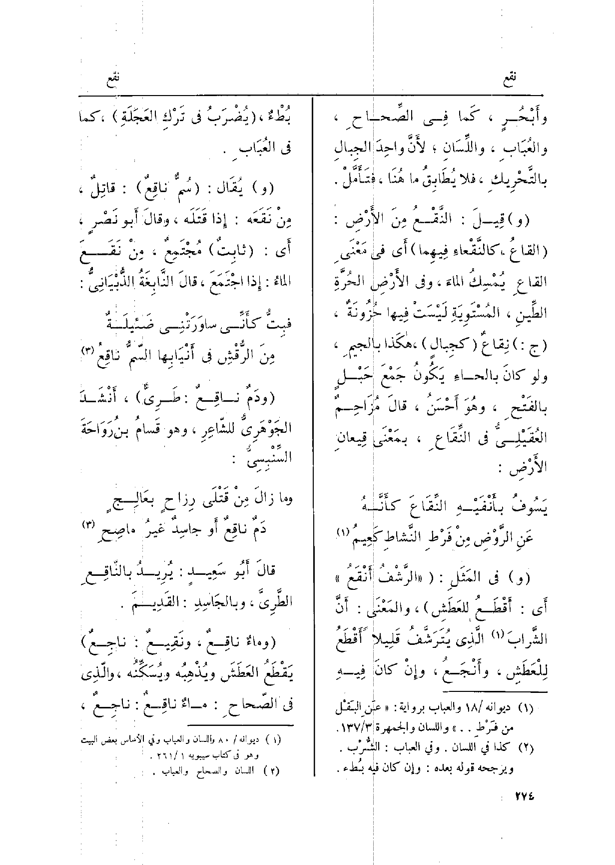 وقيلَ: النَّقْعُ منَ الأرْضِ: القاعُ، كالنَّقْعاءِ أَي فِي مَعْنَى القاعِ يُمْسِكُ الماءَ، وَفِي الأرْضِ الحُرَّةِ الطِّينِ، المُسْتَوِيَةِ لَيْسَتْ فِيهَا حُزُونَةٌ، ج: تِفاعٌ كجِبالٍ هَكَذَا بالجيمِ، وَلَو كانَ بالحاءِ يَكُونُ جَمْعَ حَبْلٍ بالفَتْحِ، وهُوَ أحْسَنُ، قالَ مُزَاحِمٌ العُقَيْلِي فِي النِّقَاعِ، بمَعْنَى قِيعانِ الأرْضِ:
