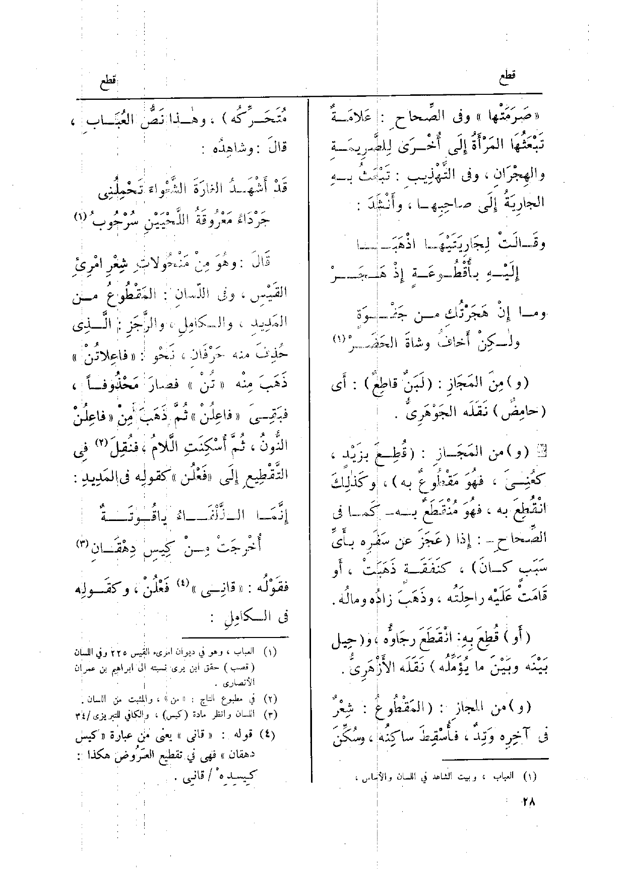 قاَلَ: وهُوَ مِنْ مَنْحُولاتِ شِعْرِ امْرِئِ القَيْسِ، وَفِي اللّسانِ: المَقْطُوعُ من المَدِيد، والكامِلِ، والرَّجَزِ: الَّذِي حُذِفَ مِنْهُ حَرْفَانِ، نَحْو: فاعِلاتُنْ ذهَبَ مِنْه تُنْ فصارَ مَحْذُوفاً، فبَقِيَ فاعِلُنْ ثُمَّ ذَهَبَ مِنْ فاعِلُنْ النُّونُ، ثُمَّ اُسكِنَتِ اللامُ، فنُقِلَ فِي التَّقْطِيعِ إِلَى فَعْلُن كقولِه فِي المَديدِ:
