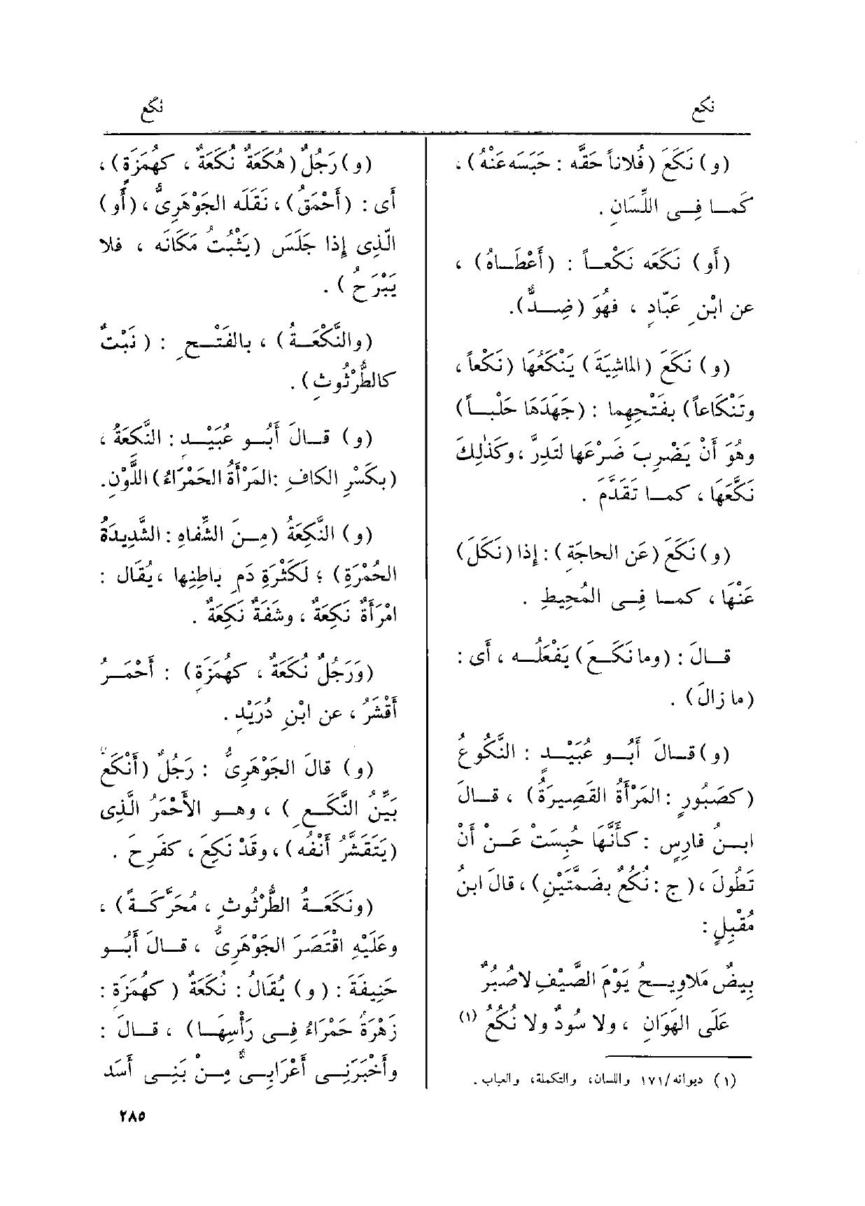 ونَكَعَ عَن الحاجَةِ: إِذا نَكَلَ عَنْهَا، كَمَا فِي المُحِيطِ.)