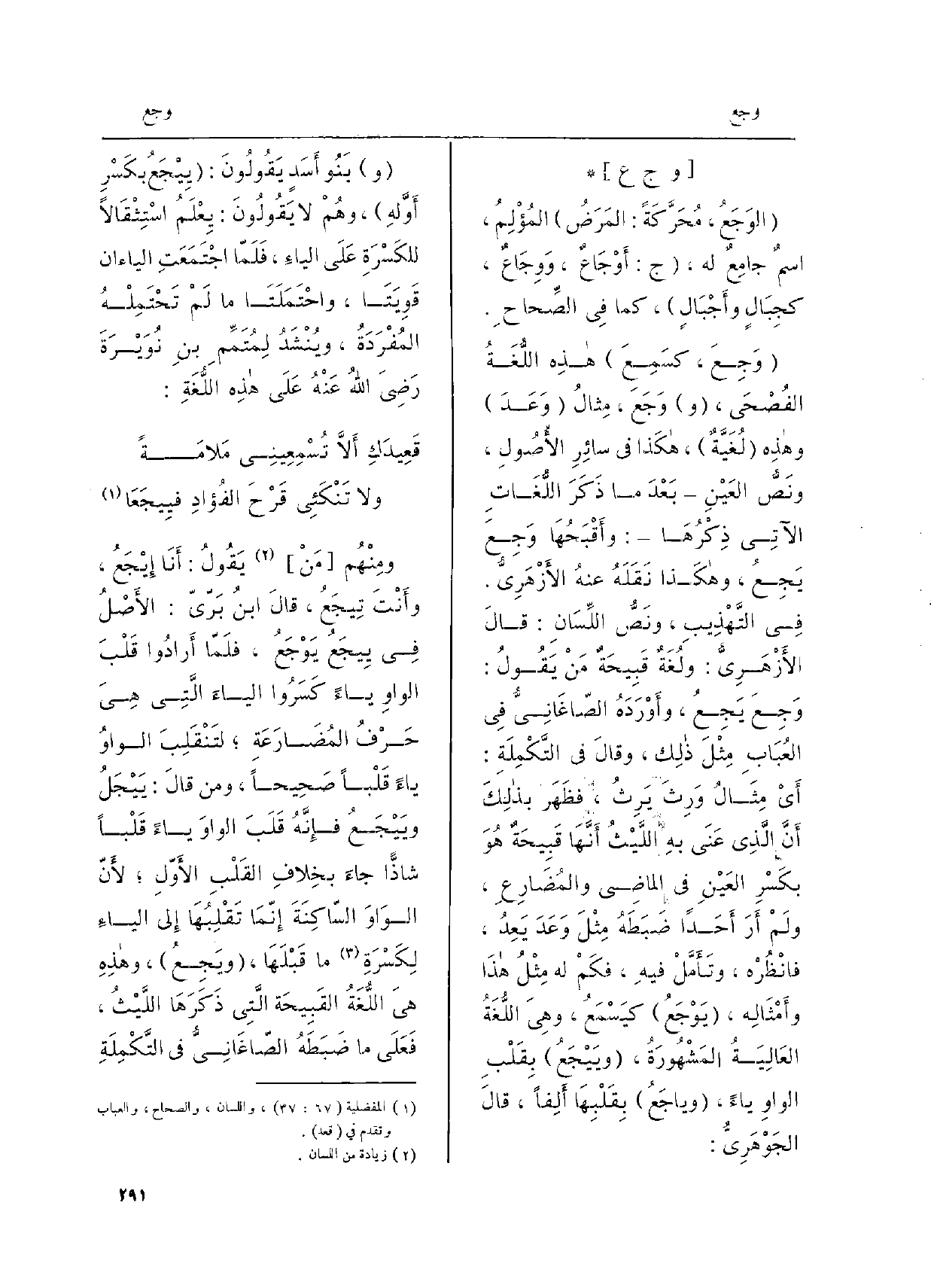 فِي التَّهْذِيبِ، ونَصُّ اللِّسَانِ: قالَ الأزْهَرِيُّ: ولُغَةٌ قَبيحَةٌ منْ يَقُولُ: وَجِعَ يَجِعُ، وأوْرَدَهُ الصّاغَانِيُّ فِي العُبَابِ مِثْلَ ذَلِك، وقالَ فِي التَّكْمِلَةِ: أيْ مِثَالُ وَرِثَ يَرِثُ، فظَهَر بذلكَ أنَّ الّذِي عَنَى بهِ اللَّيْثُ أنَّهَا قَبيحَةٌ هُوَ بكَسْرِ العَيْنِ فِي الْمَاضِي والمُضَارِع، ولَمْ أرَ أحَداً ضَبَطَهُ مِثْلَ وَعَدَ يَعِدُ، فانْظُرْه، وتأمَّلْ فيهِ، فكَمْ لَهُ مِثْلُ هَذَا وأمْثَالِه،} يَوْجَعُ كيَسْمَعُ، وهِيَ اللغَةُ العَالِيَةُ المَشْهُورَةُ، {ويَيْجَعُ بِقَلْبِ الواوِ يَاء،} وياجَعُ بقَلْبِهَا ألِفاً، قالَ الجَوْهَرِيُّ: وبَنُو أسَدٍ يَقُولونَ: {يِيْجَعُ بكَسْرِ أوَّلِه، وهُمْ لَا يَقُولونَ: يعْلَمُ اسْتِثْقالاً للكَسْرَة على الياءِ، فلمّا اجْتَمَعَتِ الياءان قَوِيتَا، واحْتَمَلَتَا مَا لَمْ تَحْتَمِلْهُ المُفْرَدَةُ، ويُنْشَدُ لِمُتَمِّمِ بنِ نُوَيْرَةَ رَضِي الله عنهُ على هَذِه اللُّغَةِ: