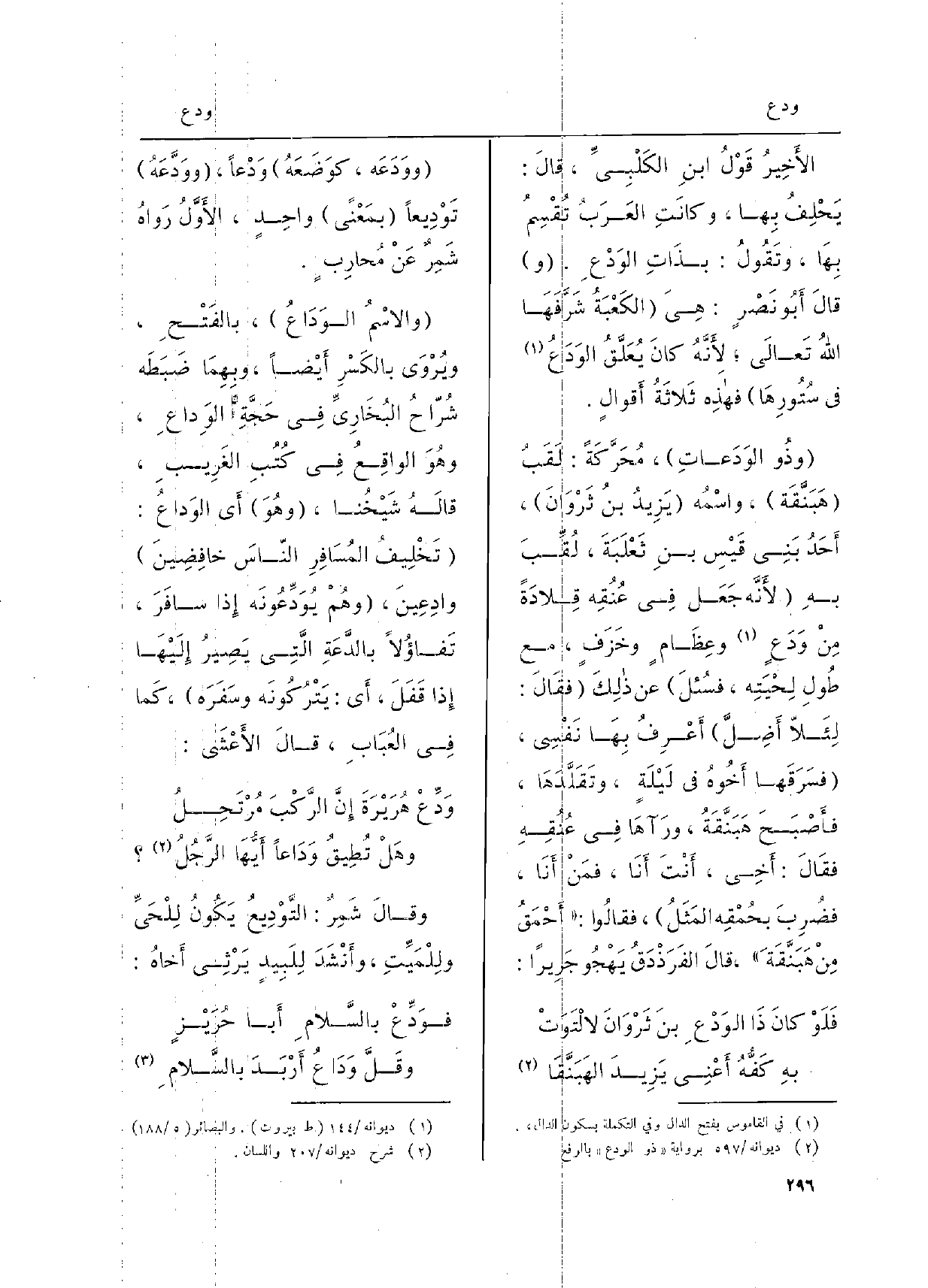 {ووَدَعَه، كوَضَعَهُ} وَدْعاً، {ووَدَّعَهُ} تَوْدِيعاً بمَعْنىً واحدٍ، الأوَّلُ رَواهُ شَمِرٌ عنْ مُحارِبٍ.