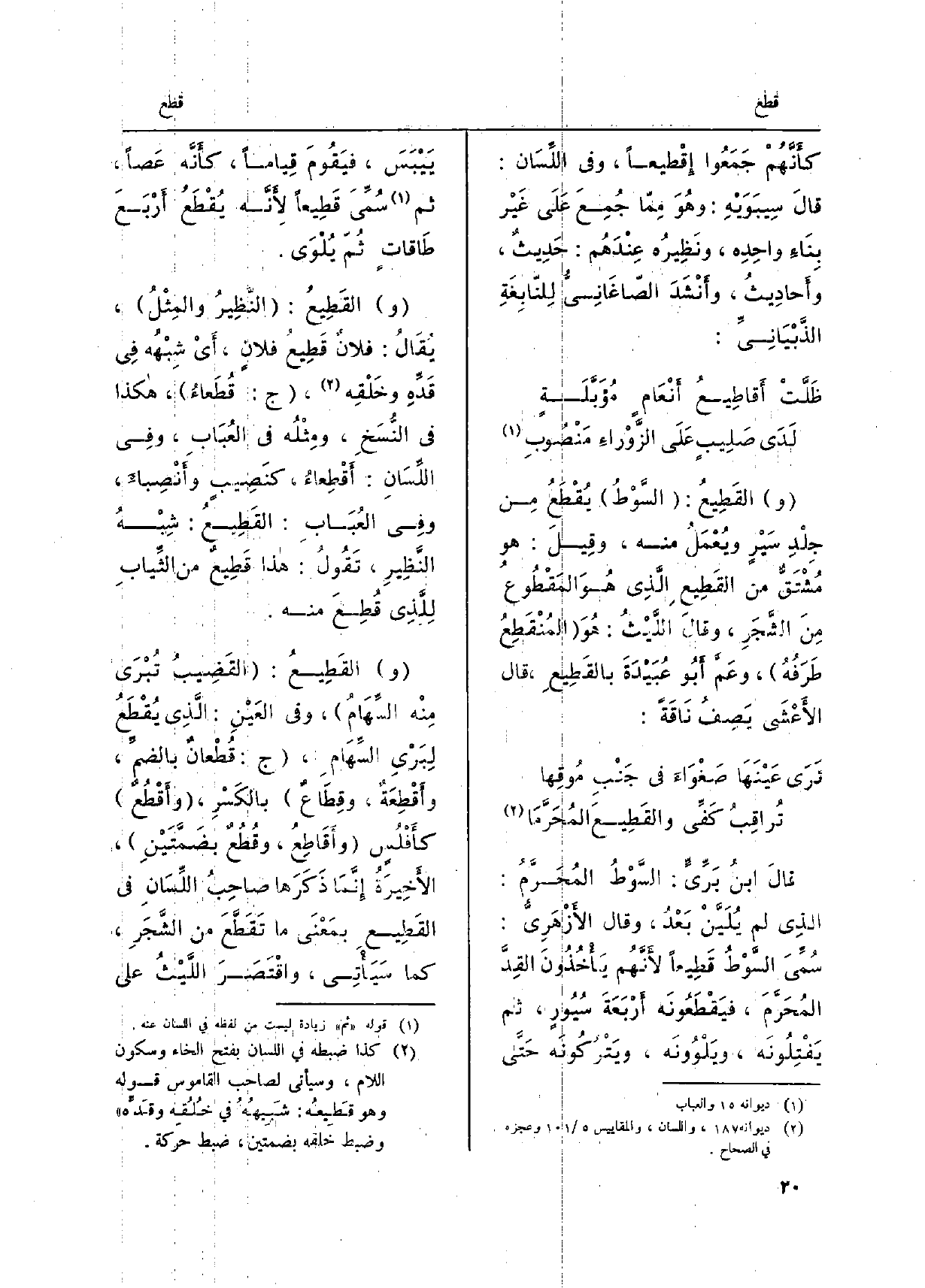 كأنَّهُم جَمَعُوا إقْطِيعاً. وَفِي اللِّسَان: قالَ سِيبَويْهِ: وهُوَ مِمّا جُمِعَ على غَيْر بِنَاءِ واحِدِه، ونَظِيرُه عِنْدَهُم: حَدِيثٌ، وأحادِيثُ، وأنْشَدَ الصّاغَانِيُّ للِنّابِغَةِ الذَّبْيَانِيِّ: