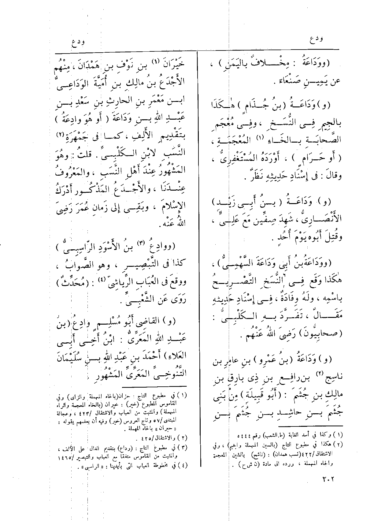 ووَدَاعَةُ بنُ عَمْرو بنِ عامِرِ بن ناسِج بنِ رافِعِ بنِ ذِي بارِقِ بنِ مالِكِ بنِ جُشَمَ: أَبُو قَبِيلَةِ منْ بَنِي جُشَمَ بنِ حاشِدِ بنِ جُشَمَ بنِ خَيْرانَ بنِ نَوْفِ بنِ هَمْدانَ، منْهُم الأجْدَعُ بنُ مالكِ بنِ أُمَيَّةَ {- الوَدَاعِيُّ ابْن مَعْمَرِ بنِ الحارِثِ بنِ سَعْدِ بنِ عَبدِ اللهِ بنِ وَدَاعَةَ أَو هُوَ} وادِعَةُ بتَقْدِيمِ الألِفِ، كَمَا فِي جَمْهَرَةِ النَّسَبِ عِنْدَ أهْلِ النَّسَبِ، والمَعْرُوفُ عِنْدَنا، والأجْدَعُ المَذْكُورُ أدْرَكُ الإسلامَ، وَبَقِي إِلَى زَمانِ عُمَرَ رَضِي الله عَنهُ.