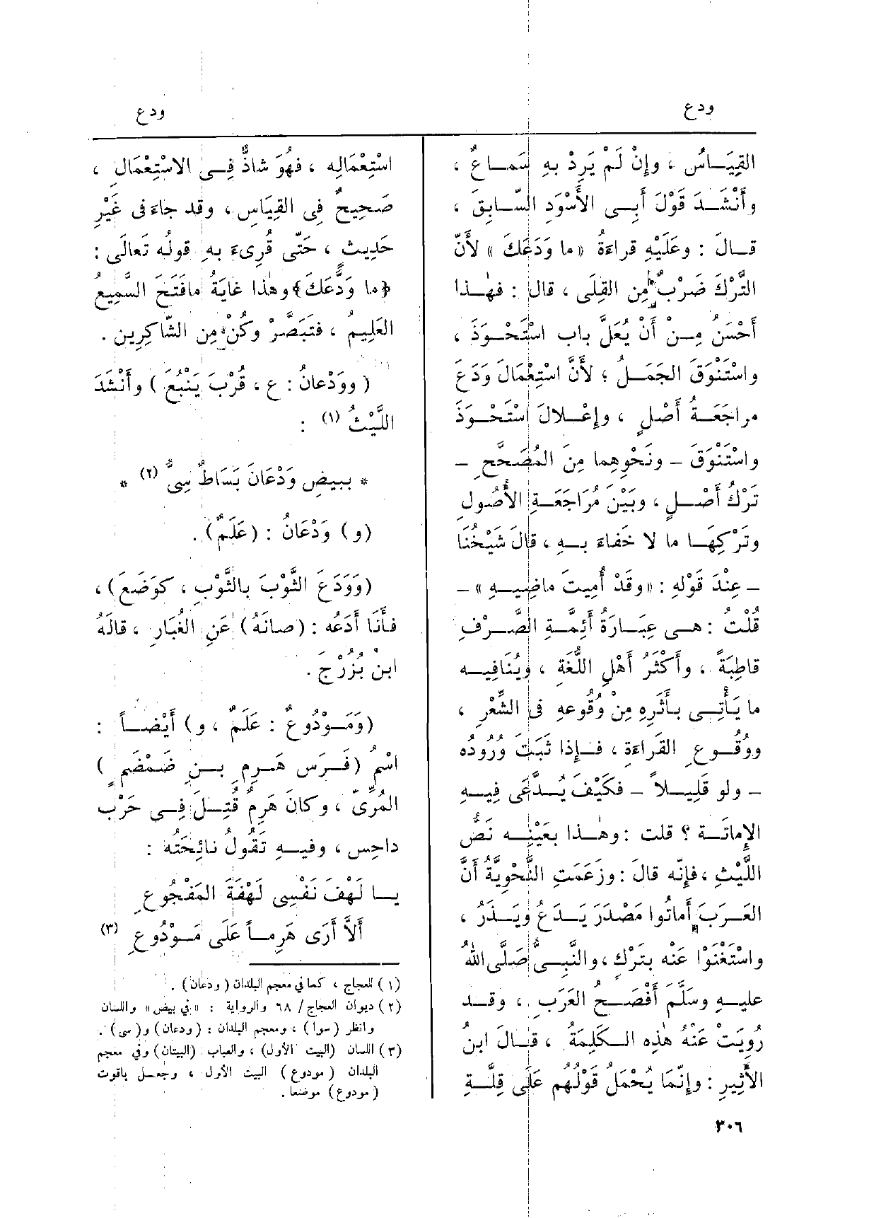 القيَاسُ، وإنْ لَمْ يُرِدْ بهِ سَماعٌ، وأنْشَدَ قَوْلَ أبي الأسْوَدِ السّابِقَ، قالَ: وعليْهِ قراءَةُ مَا {وَدَعَكَ لأنّ التَّرْكَ ضَرْبٌ من القِلَى، قَالَ: فَهَذَا أحْسَنُ منْ أنْ يُعَلَّ بَاب اسْتَحْوَذَ، واسْتَنْوَقَ الجَمَلُ لأنَّ اسْتِعْمالَ} وَدَعَ مراجَعَةُ أصْلٍ، وإعْلالَ اسْتَحْوَذَ واسْتَنْوَقَ ونَحْوِهِما منَ المُصَحَّحِ تَرْكُ أصْلٍ،)