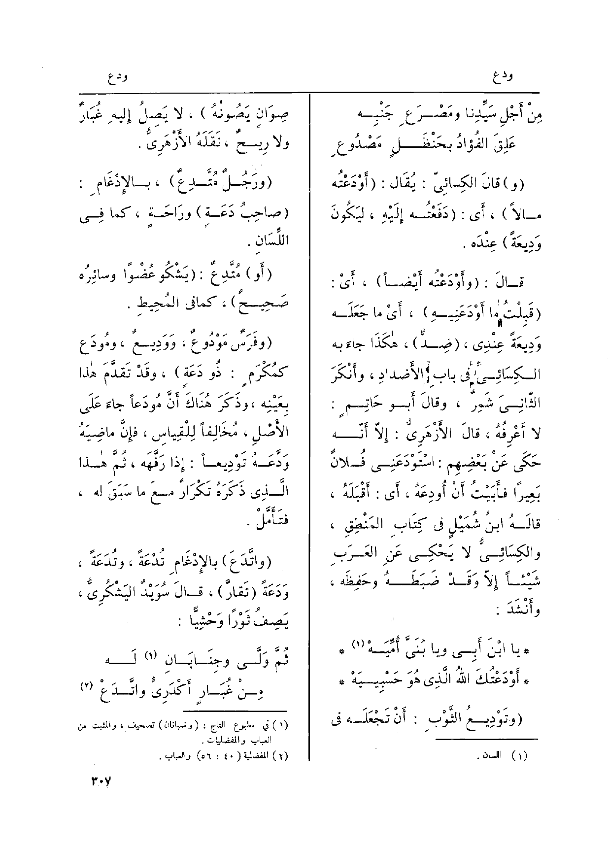 قالَ: {وأوْدَعْتُه أيْضاً أَي: قَبِلْتُ مَا} أوْدَعَنِيهِ، أَي مَا جَعَلَه {وَدِيعَةً عِنْدِي، ضِدٌّ هَكَذَا جاءَ بِهِ الكِسَائِيِّ فِي بابِ الأضدادِ، وأنْكَرَ الثانيَ شَمِرٌ، وقالَ أَبُو حاتِمٍ: لَا أعْرِفُهُ، قالَ الأزْهَرِيُّ: إِلَّا أنَّه حَكَى عَن بَعْضِهِم:} - اسْتَودَعَنِي فُلانٌ بَعِيراً فأبَيْتُ أنْ {أُودِعَهُ، أَي: أقْبَلَهُ، قالَهُ ابنُ شُمَيْلٍ فِي كِتَابِ المَنْطِقِ، والكِسَائِيُّ لَا يَحْكِي عَنِ العَرَبِ شَيئاً إِلَّا وقَدْ ضَبَطَهُ وحَفِظَهُ، وأنْشَدَ: يَا ابْنَ أبي وَيَا بُنَيَّ أُمِّيَهْ} أوْدَعْتُكَ اللهُ الّذِي هُوَ حَسِبِييَهْ {وتَوْدِيعُ الثَّوْبِ: أنْ تَجْعَلَه فِي صِوَانٍ يَصُونُهُ، لَا يَصِلُ إليهِ غُبَارٌ وَلَا رِيحٌ، نَقَلَه الأزْهَرِيُّ.