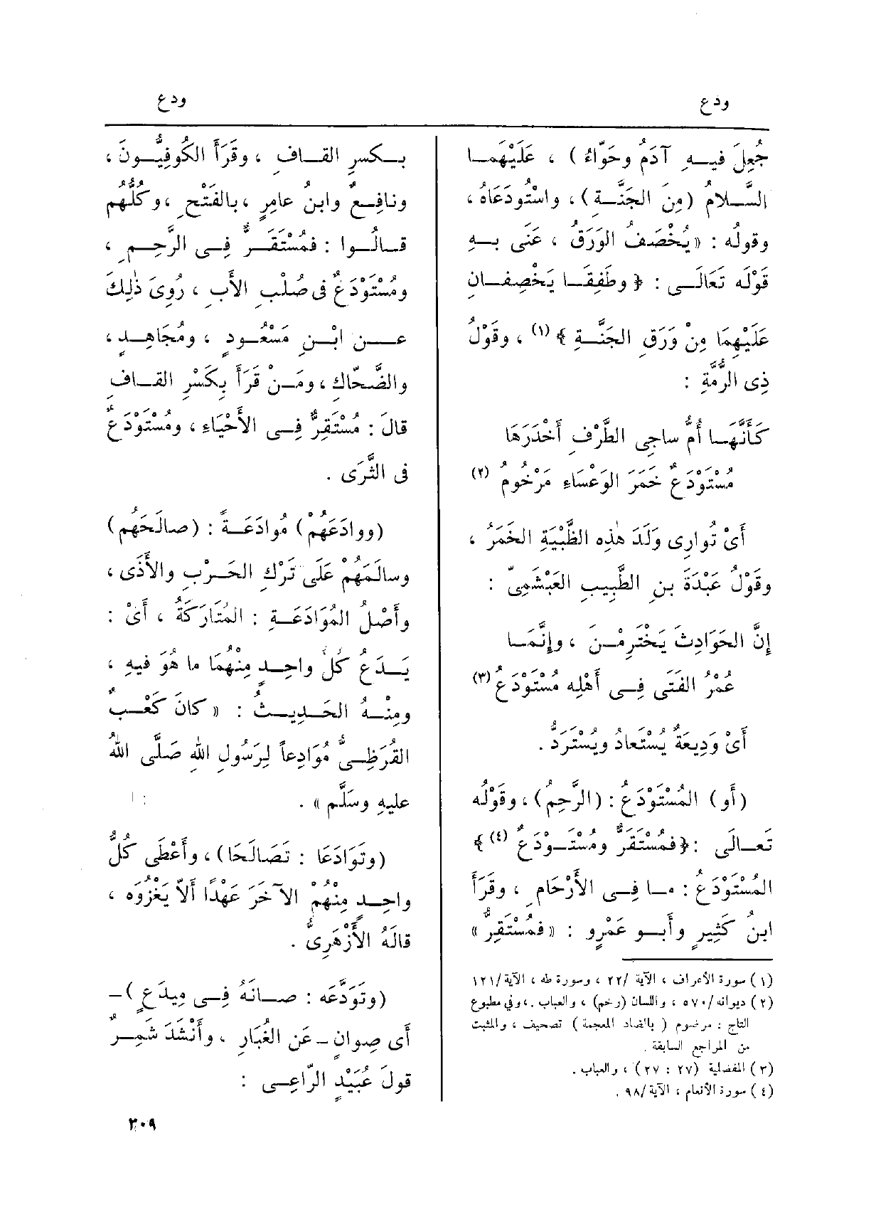 أَو {المُسْتَوْدَعُ: الرَّحِمُ وقوْلُه تَعَالَى: فمُسْتَقَرٌّ} ومُسْتَوْدَعٌ المُسْتَوْدَعُ: مَا فِي الأرْحَامِ وقرَأ ابنُ كَثِيرٍ وَأَبُو عَمْروٍ: فمُسْتَقِرٌّ بكسرِ القافِ، وقَرَأ الكُوفِيُّونَ، ونافِعٌ وابنُ عامِرٍ، بالفَتْحِ، وكُلُّهُم قالُوا: فمُسْتَقَرٌّ فِي الرَّحِمِ، ومُسْتَوْدَعٌ فِي صُلْبِ الأبِ، رُوِيَ ذلكَ عَن ابْنِ مَسْعُودٍ، ومُجَاهِدٍ، والضَّحّاكِ ومنْ قَرَأَ بكَسْرِ القافِ قالَ: مُسْتَقِرٌّ فِي الأحْيَاءِ، ومُسْتَوْدَعٌ فِي الثَّرَى.