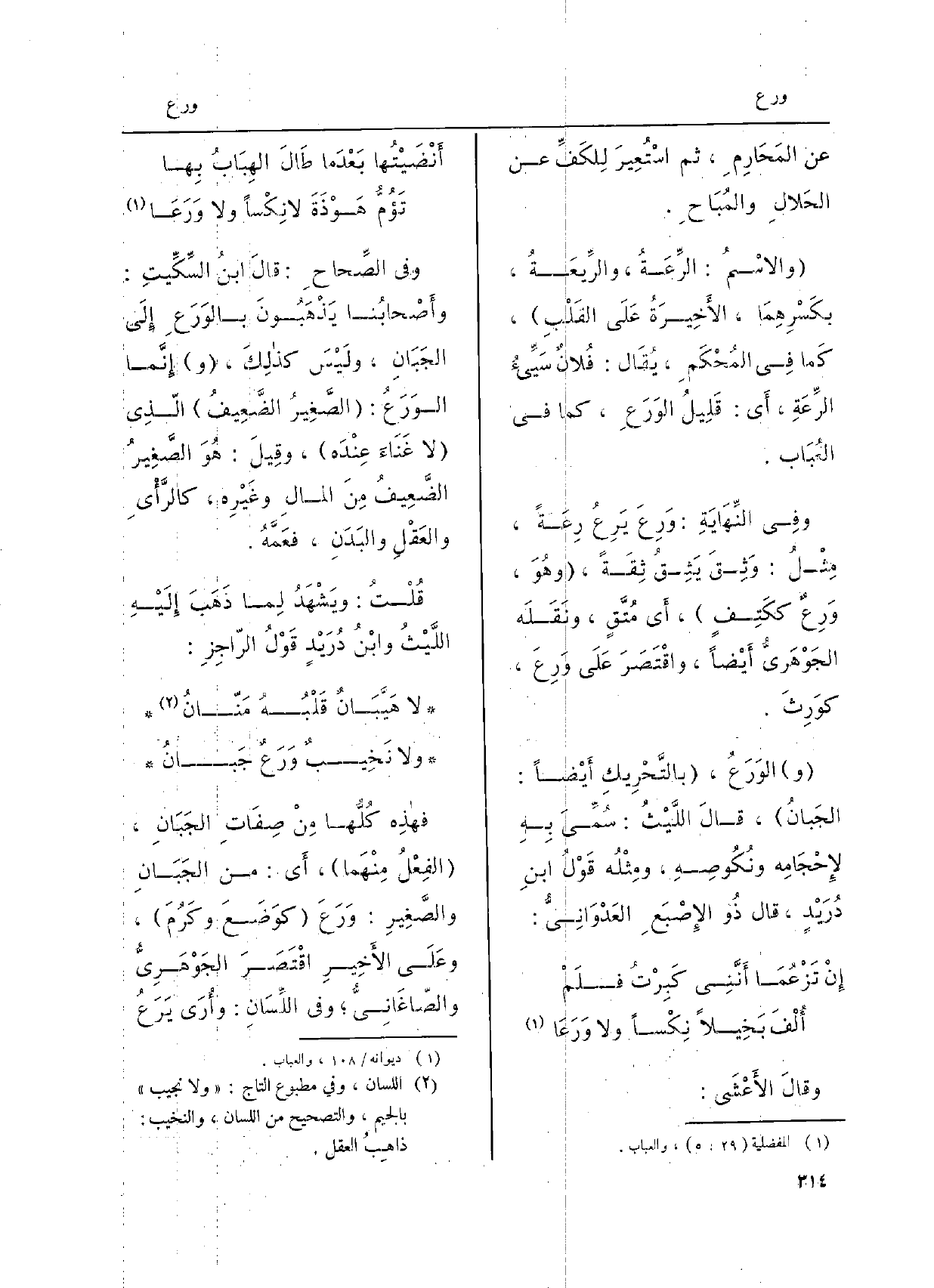 (و) } الوَرَعُ، بالتَّحْرِيكِ أيْضاً: الجَبَانُ، قالَ اللَّيْثُ: سُمِّيَ بهِ لإحْجَامِه ونُكُوصِهِ، ومِثْلُه قَوْلُ ابنِ دُرَيدٍ، قالَ ذُو الإصْبَعِ العَدْوَانِيُّ:
