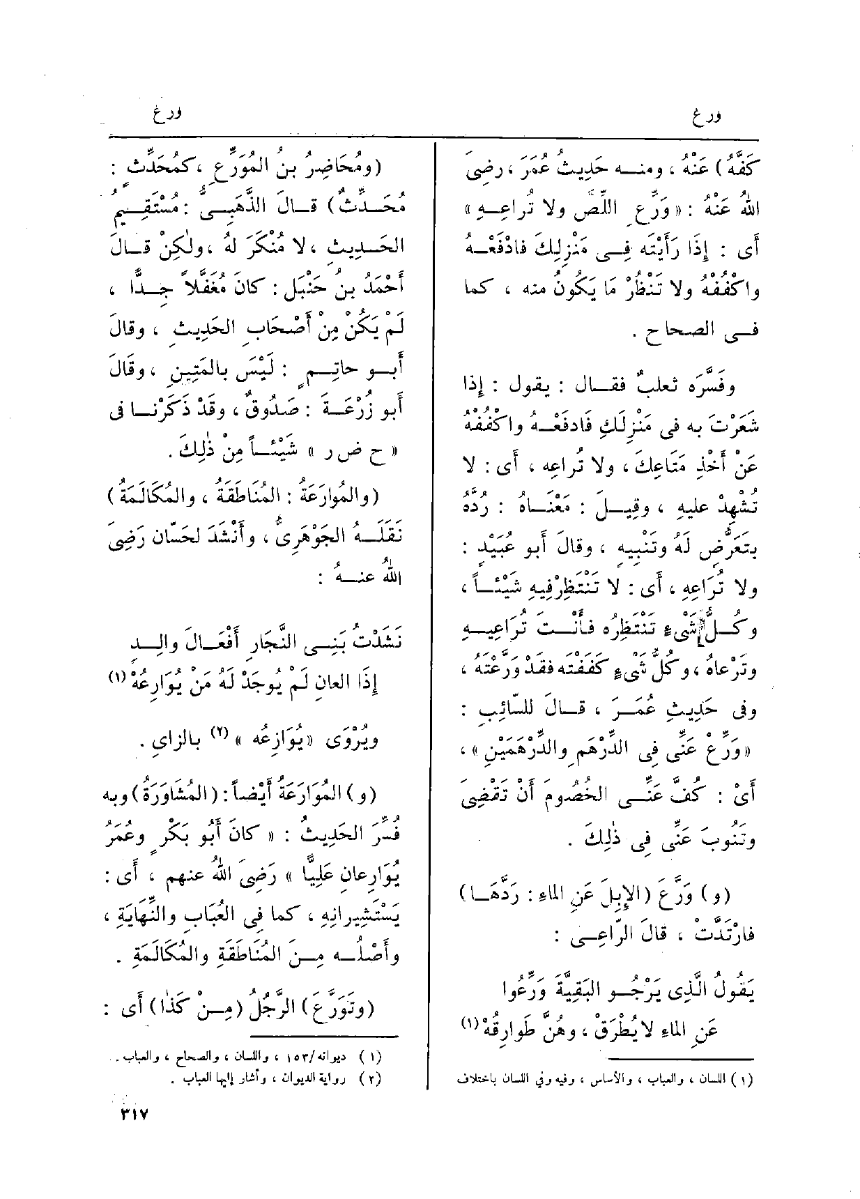 وفَسَّرَه ثعلبٌ فَقَالَ: يَقُول: إِذا شَعَرْتَ بِهِ فِي مَنْزِلَكِ فادْفَعْهُ واكْفُفْهُ عَن أخْذِ مَتاعِكَ، وَلَا {تُراعِهِ، أَي: لَا تُشْهِدْ عليهِ، وقيلَ: مَعْناهُ: رُدَّهُ بتَعَرُّضٍ لَهُ وتَنْبِيهٍ، وقالَ أَبُو عُبَيدٍ: وَلَا تُرَاعِهِ، أَي: لَا تَنْتَظِرْ فيهِ شَيئاً، وكُلُّ شَيءٍ تَنْتَظِرُه فأنْتَ تُرَاعِيهِ وتَرْعاهُ، وكُلُّ شَيءٍ كَفَفْتَه فقَدْ} وَرَّعْتَهُ، وَفِي حديثِ عُمَرَ، قالَ للسّائِبِ: {وَرِّعْ عَنيِّ فِي الدِّرْهَمِ والدِّرْهَمَيْنِ، أَي: كُفَّ عَنِّي الخُصُومَ أنْ تَقْضِيَ وتَنُوبَ عَنِّي فِي ذلكَ.