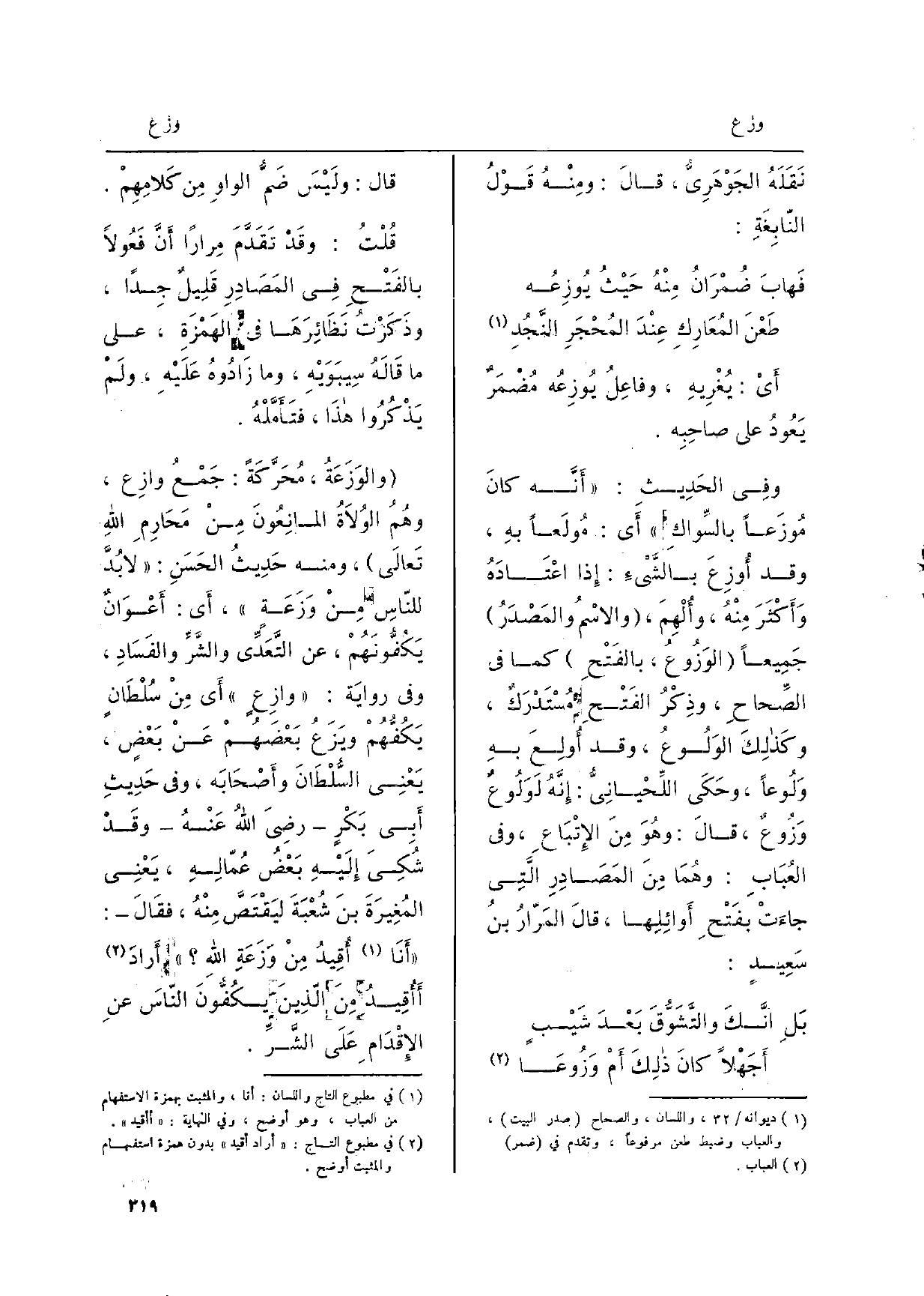 وَفِي الحَدِيث: أنَّه كانَ} مُوزَعاً بالسِّواكِ، أَي: مُولَعاً بهِ، وَقد {أُوزِعَ بالشَّيْءِ: إِذا اعْتادَهُ وأكْثَرَ مِنْهُ، وأُلْهِمَ، والاسْمُ والمَصْدَرُ جَمِيعاً} الوَزُوعُ، بالفَتْحِ كَمَا فِي الصِّحاحِ وذكْرُ الفَتْحِ مُسْتَدْرَكٌ، وكذلكَ الوَلُوعُ، وَقد أُولِعَ بهِ وَلُوعاً، وحَكَى اللِّحْيَانِيُّ: إنَّهُ لَوَلوعٌ وَزُوعٌ، قالَ: وهُوَ منَ الإتْبَاعِ، وَفِي العُبابِ: وهُمَا منَ المَصَادِرِ الّتِي جاءَتْ بفَتْحِ أوائِلِها، قالَ المَرّارُ بنُ سَعِيدٍ:)