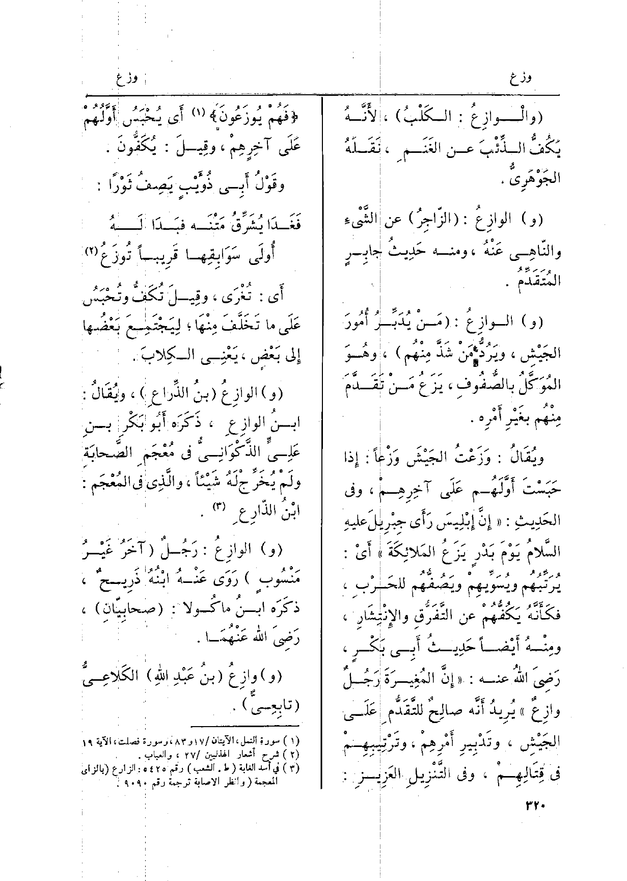 والوازِعُ: منْ يُدَبِّرُ أُمُورَ الجَيْشِ، ويَرُدُّ منْ شَذَّ مِنْهُم، وهُوَ المُوَكَّلُ بالصُّفُوفِ، {يَزَعُ منْ تَقَدَّمَ ويَرُدُّ منْ شَذَّ مِنْهُمْ وهوَ المُوَكَّلُ بالصُفُوفِ يَزَعُ منْ تَقَدَّمَ مِنْهُم بغَيْرِ أمْرِه.
