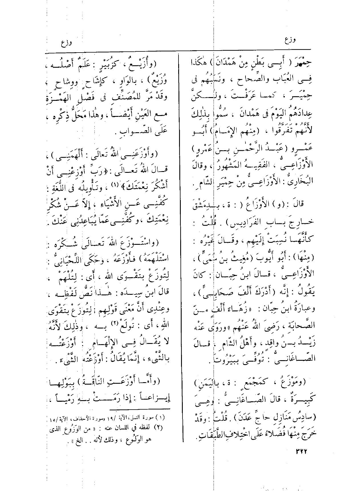 } - وأوْزَعَنِي الله تَعَالَى: ألْهَمَنِي، قالَ اللهُ تَعَالَى: رَبِّ {- أوْزِعْنِي أنْ أشْكُرَ نِعْمَتَكَ وتَأْوِيلُه فِي اللُّغَةِ: كُفَّنِي عنِ الأشْيَاءِ، إِلَّا عنْ شُكْرِ نِعْمَتِكَ، وكُفّنِي عَمّا يُبَاعِدُنِي عَنْكَ.