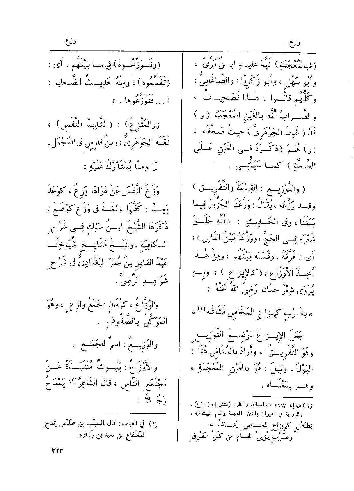 } والأوْزَاعُ: بُيُوتٌ مُنْتَبَذَةٌ عنْ مُجْتَمَعِ النّاسِ، قالَ الشّاعِرُ يَمْدَحُ رجلا: