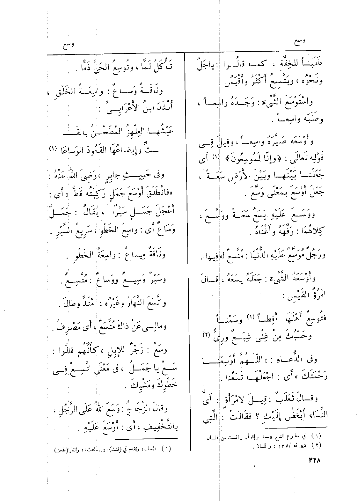 وَفِي حديثِ جابِرٍ: رَضِي الله عنهُ: فانْطَلَقَ أوْسَعَ جَمَلٍ رَكِبْتُه قَطُّ أَي: أعْجَلَ جَمَلٍ سَيْراً، يُقَالُ: جَمَلٌ {وَسَاعٌ أَي: واسِعُ الخَطْوِ، سَرِيعُ السَّيْرِ.)