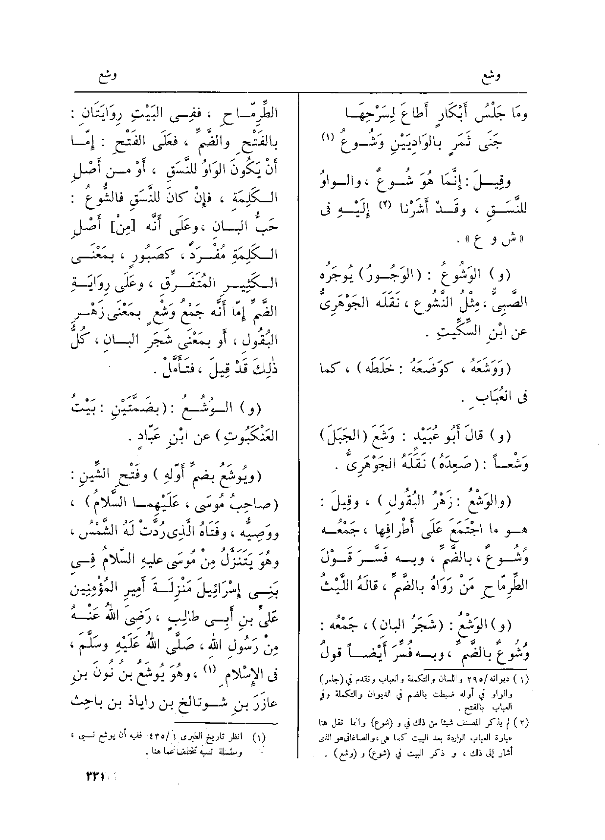 (و) {الوَشْعُ: شَجَرُ البانِ، جَمْعُه:} وُشُوعٌ بالضَّمِّ وَبِه فُسِّرَ أيْضاً قَولُ الطِّرِمّاحِ فَفِي البَيْتِ رِوَايَتانِ: بالفَتْحِ والضَّمِّ، فعلى الفَتْحِ: إمّا أنْ يَكُونَ الواوُ للنَّسَقِ، أوْ من أصْلِ الكَلِمَةِ، فإنْ كانَ للنَّسَقِ {فالشُّوعُ: حَبُّ البانِ، وعَلى أنَّه منْ أصْلِ الكلِمَةِ مُفْرَدٌ، كصَبُورٍ، بمَعْنى الكَثِيرِ المُتَفَرِّقِ، وعَلى رِوايَةِ الضَّمِّ إمّا أنَّه جَمْعُ} وَشْعٍ بمَعْنَى زَهْرِ البُقُولِ، أَو بَمَعْنَى شَجَرِ البانِ كُلُّ ذلكَ قدْ قيلَ، فتأمَّلْ.