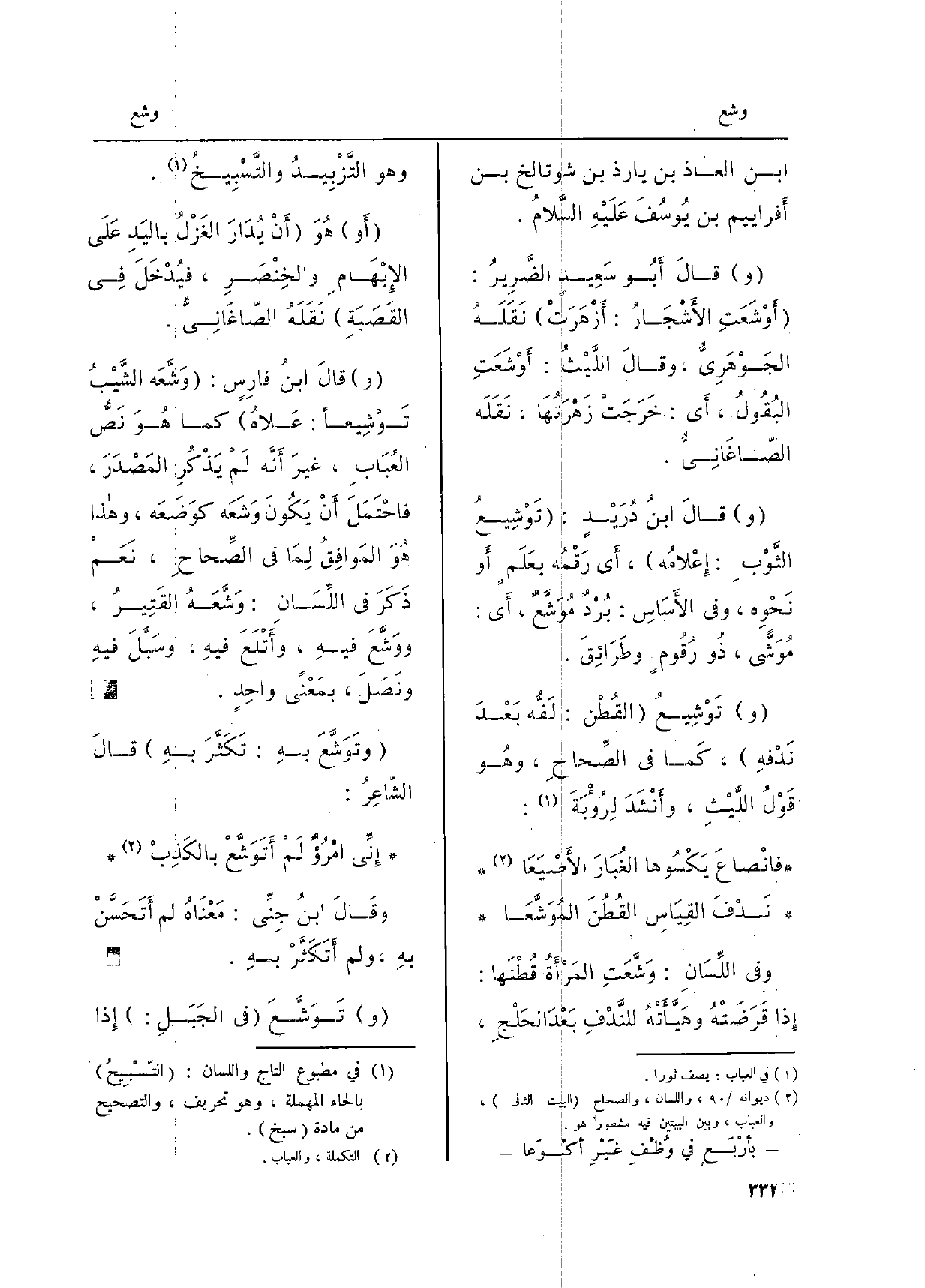 {وتَوَشَّعَ بهِ: تَكَثَّرَ بهِ قالَ الشّاعِرُ: إنِّي امْرُؤٌ لم} أتَوَشَّعْ بالكَذِبْ وقالَ ابنُ جِنِّي: مَعْنَاهُ لم أتَحَسَّنْ بهِ، وَلم أتَكَثَّرْ بهِ.