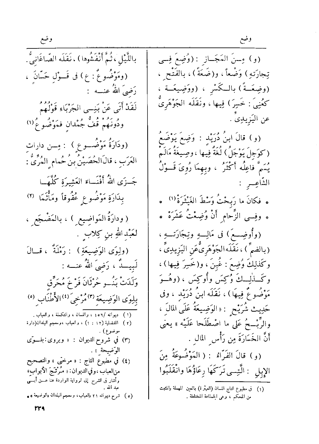 فكانَ مَا رَبِحْتُ وَسْطَ الغَثْيَرَةْ وَفِي الزِّحامِ أنْ} وُضِعْتُ عَشَرَهْ {وأُوضِعَ فِي مَالِهِ وتِجارَتِه، بالضَّمِّ نَقَلَه الجَوْهَرِيُّ عَن اليزيديِّ، وكذلكَ وُضِعَ: غُبِنَ، وخَسِرَ فِيهَا، وكذلكَ وُكِسَ وأُوكِسَ، وهُوَ} مَوْضُوعٌ فِيهَا، نَقَلَه ابنُ دُرَيدٍ، وَفِي حديثِ شُرَيحٍ: {الوَضِيعَةُ على المالِ، والرِّبْحُ على مَا اصْطَلَحا عَلَيْهِ يَعْنِي أنَّ الخَسَارَةَ منْ رَأْسِ المالِ.