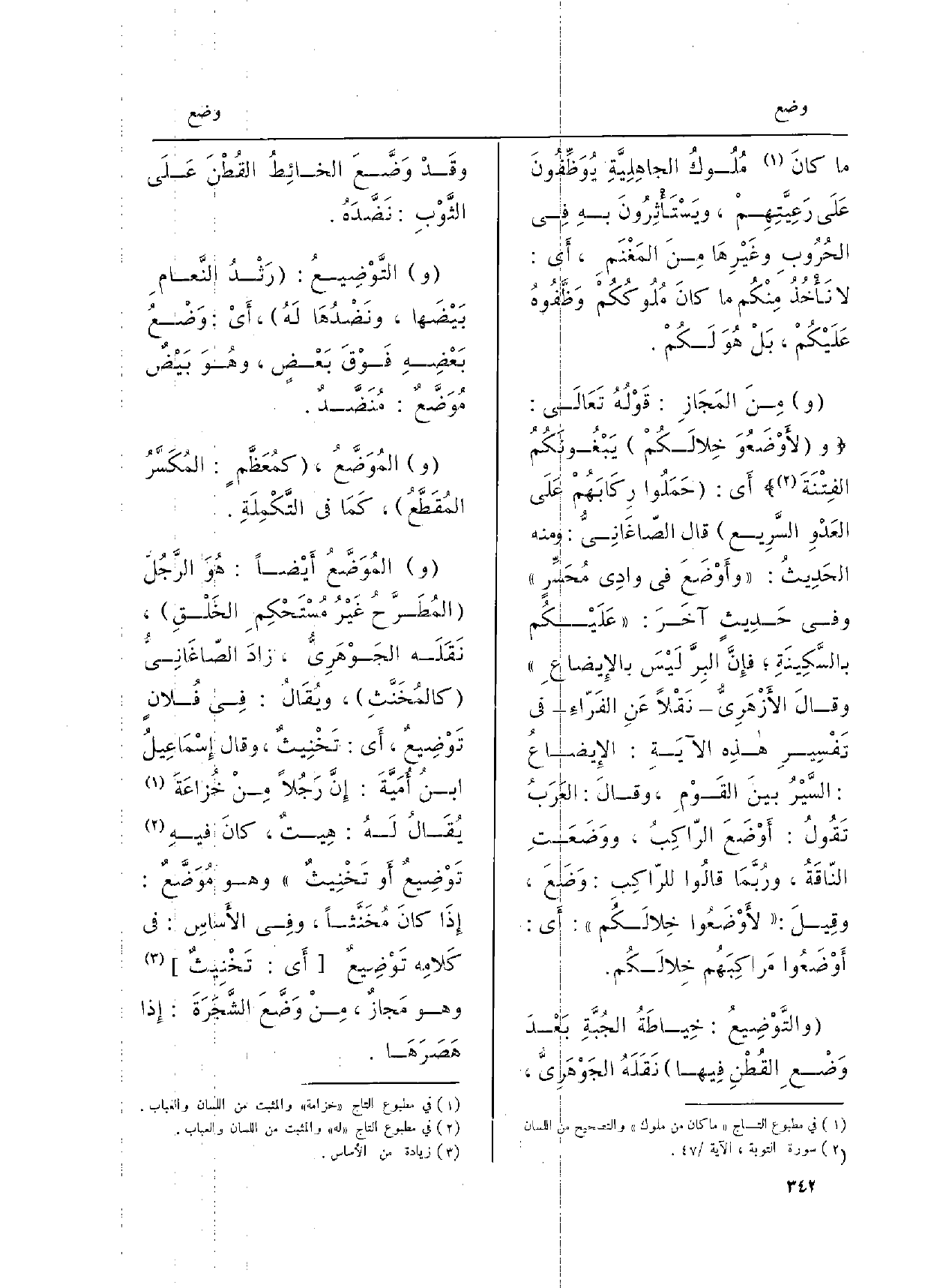 قالَ الصّاغَانِيُّ: وَمِنْه الحديثُ:} وأوْضَعَ فِي وادِي مُحَسِّرٍ، وَفِي حديثٍ آخَرَ: عَلَيْكُم بالسَّكِينَةِ، فإنَّ البِرَّ لَيْسَ {بالإيضاعِ، وقالَ الأزْهَرِيُّ: نَقْلاً عنِ الفَرّاءِ فِي تَفْسِيرِ هَذِه الآيَةِ:} الإيضاعُ: السَّيْرُ بينَ القَوْمِ، وقالَ: العَرَبُ تَقُولُ: {أوْضَعَ الرّاكِبُ، ووَضَعَتِ النّاقَةُ، ورُبَّما قالُوا للرّاكِبِ:} وَضَعَ، وقيلَ: {لأوْضَعُوا خِلالَكُم، أَي:} أوْضَعُوا مَرَاكِبَهُم خِلالَكُم.
