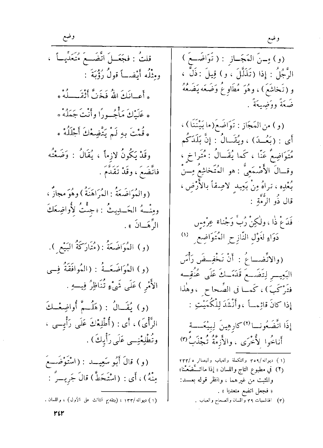 قلت: فَجعل {اتَّضعَ مُتَعَدِّياً، ومِثْلُه أَيْضا قولُ رُؤُبةَ: أعانَكَ اللهُ فَخَفَّ أَثْقَلُهْ عَلَيْكَ مَأْجُوراً وأَنْتَ جَملُهْ قُمْت بِهِ لم} يَتَّضِعَّكَ اجلله وَقد يكونُ لازِماً، يُقالُ: وَضَعْتُه {فاتَّضَعَ، وقدْ تقدم.} والمُوَاضَعَةُ: المُرَاهَنَةُ وَهُوَ مجَاز، وَمِنْه الحَدِيث: جِئْتُ {لأواضِعَكَ الرِّهَانَ. (و) } المُوَاضَعَةُ: مُتَارَكَةُ البَيْعِ. والمُوَاضَعَةُ: المُوافَقَةُ فِي الْأَمر،)
