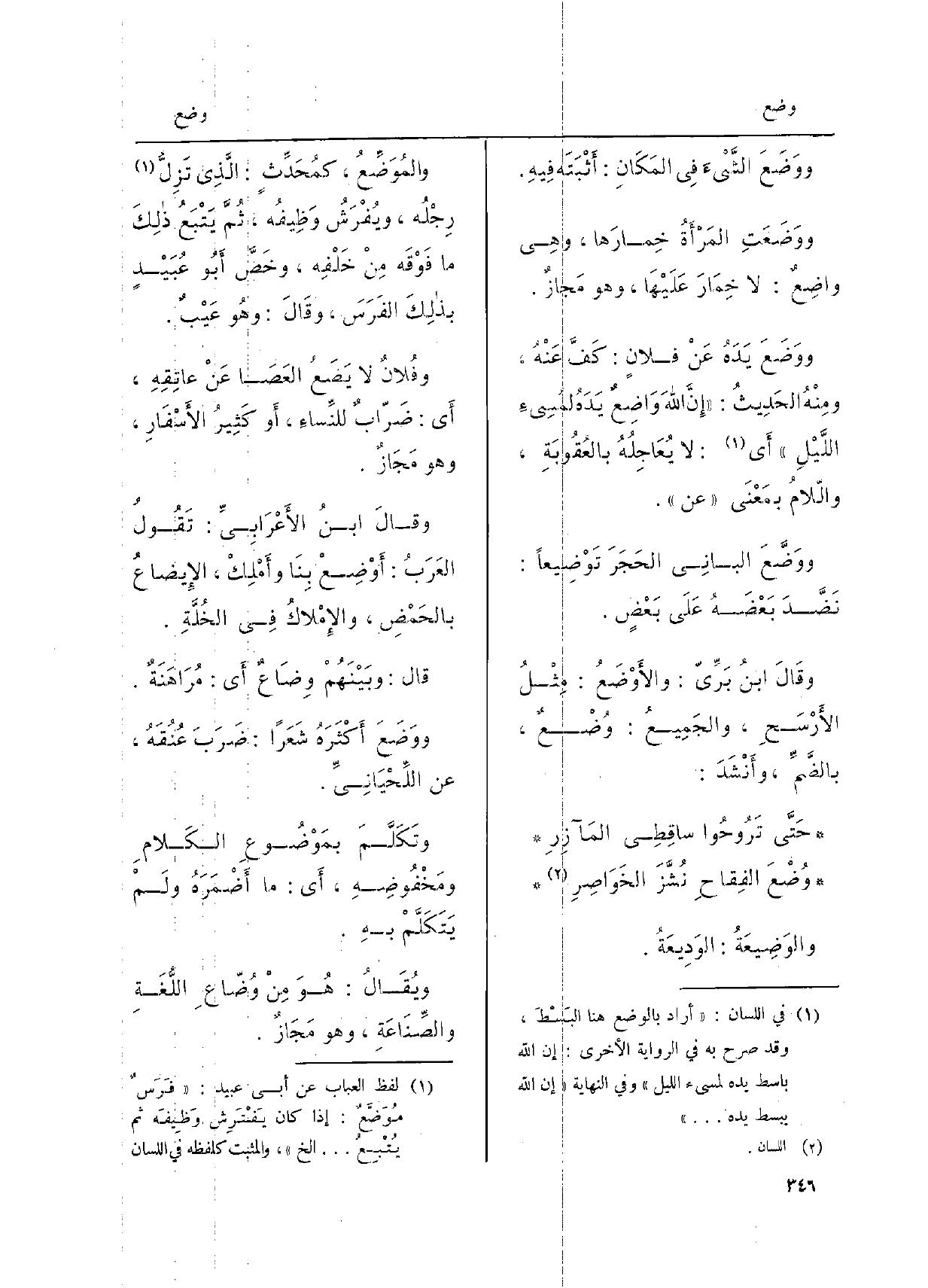 وَقَالَ ابْن الْأَعرَابِي: تَقول العربُ:} أَوْضِعْ بِنَا وأَمْلِكْ، الإيضاعُ بالحَمْضِ، والإِمْلاكُ فِي الخُلَّةِ. قَالَ: وبَيْنَهُمْ {وِضَاعٌ أَي: مُرَاهَنَةٌ.} ووَضَعَ أَكْثَرَهُ شَعَراً: ضَرَب عُنُقَهُ، عَن اللحيانيِّ. وتَكَلَّمَ {بمَوْضُوع الْكَلَام ومَخْفُوضِهِ، أَي: مَا أَضْمَرَهُ وَلم يتَكَلَّمْ بهِ.