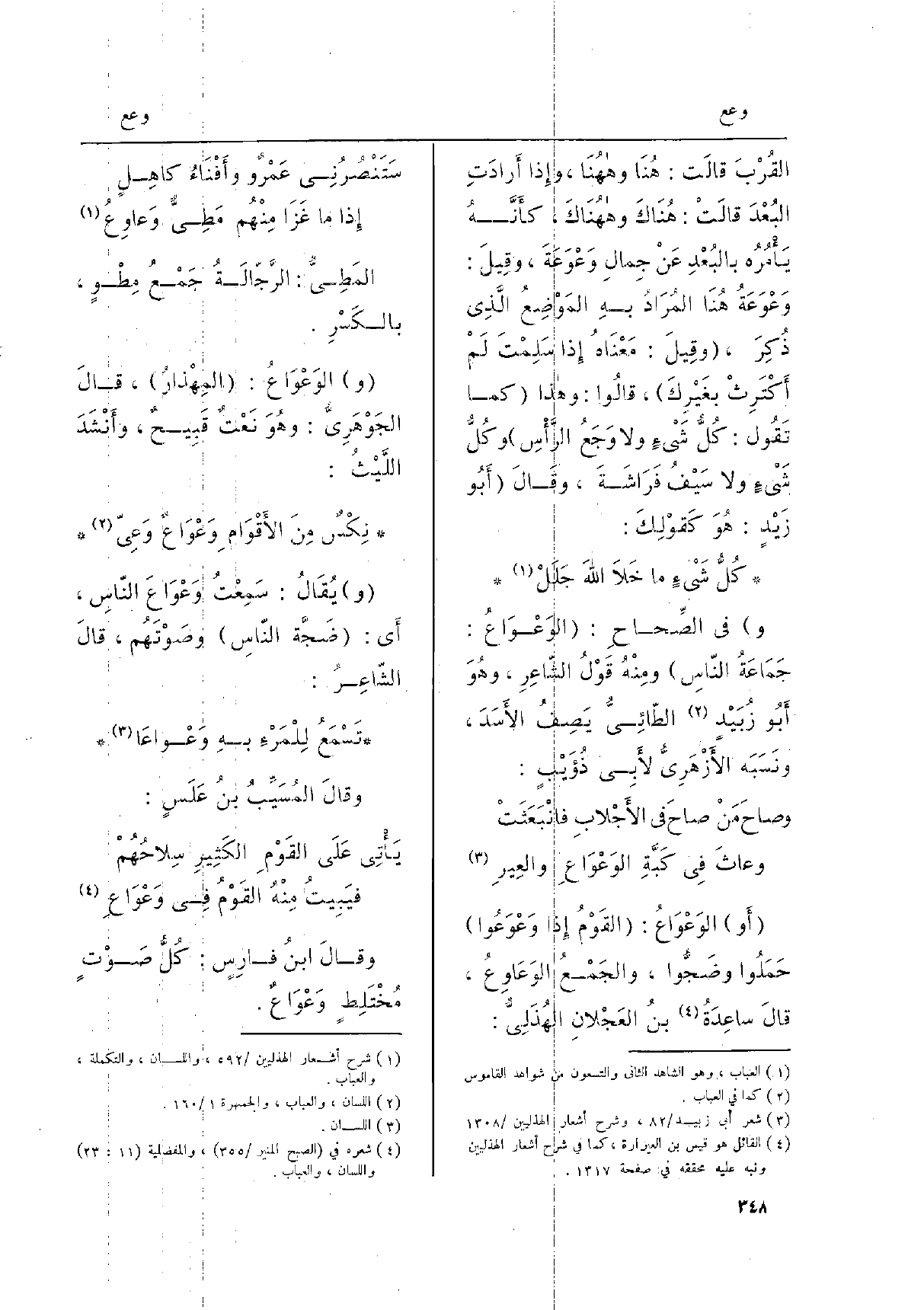 القُرْبَ قَالَت: هُنَا وههنُا، وَإِذا أرادَتِ البُعْدَ قالَتْ: هُناكَ وههُنَاكَ، كأنَّهُ يأْمُرُه بالبُعْدِ عَن جِمالِ {وَعْوَعَةَ، وقيلَ: وَعْوَعَةُ هُنَا المُرَادُ بهِ المَوْضِعُ الّذِي ذُكِرَ، وقيلَ: مَعْنَاهُ إِذا سَلِمت لمْ أكْتَرِثْ بغَيْرِكَ، قالُوا: وَهَذَا كَمَا تَقُول: كُلُّ شَيءٍ وَلَا وَجَعُ الرَّأْسِ وكُلُّ شَيءٍ وَلَا سَيْفُ فَرَاشَةَ، وقالَ أَبُو زَيْدٍ: هُوَ كقوْلِكَ: كُلُّ شَيءٍ مَا خلا اللهَ جَلَلْ وَفِي الصِّحاحِ} الوَعْوَاعُ: جَمَاعَةُ النّاسِ ومِنْهُ قَوْلُ الشّاعِرِ، وهُوَ أَبُو زُبَيْدٍ الطائِيُّ يَصِفُ الأسَدَ، ونَسَبَه الأزْهَرِيُّ لأبي ذُؤَيْبٍ: