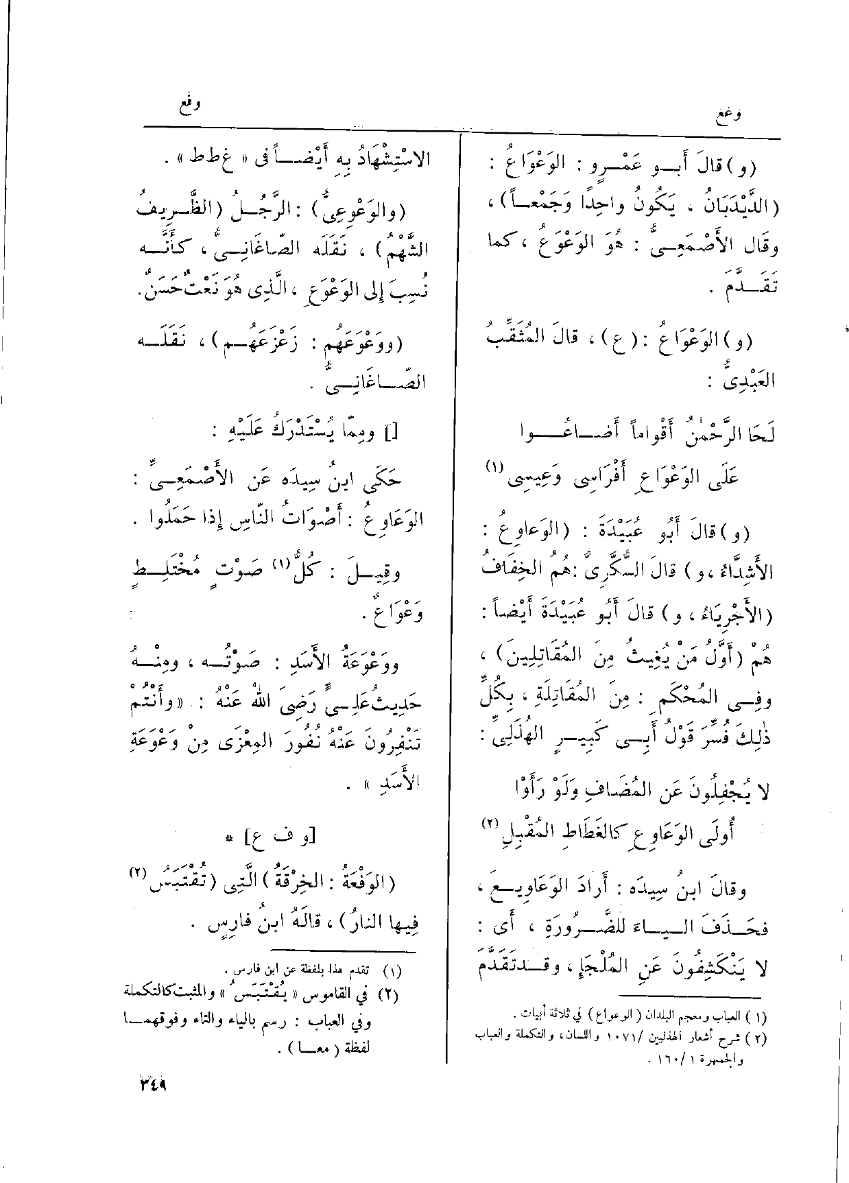 وقالَ ابنُ سِيدَه: أرادَ {الوَعَاوِيعَ، فحَذَفَ الياءَ للضَّرُورَةِ، أَي: لَا يَنْكَشِفُونَ عنِ المُلْجَإِ، وَقد تَقَدَّم الاسْتِشْهَادُ بهِ أيْضاً فِي غطط} - والوَعْوِعِيُّ: الرَّجُلُ الظَّرِيفُ الشَّهْمُ، نَقَلَه الصّاغَانِيُّ كأنَّه نُسِبَ إِلَى {الوَعْوَعِ، الّذِي هُوَ نَعْتٌ حَسَنٌ.
