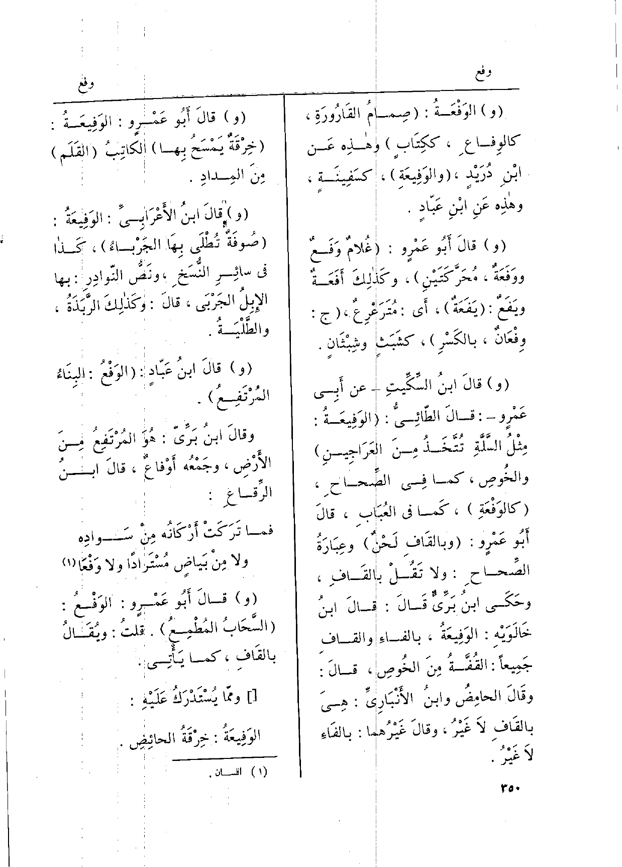 وقالَ ابنُ السِّكِّيتِ: عَن أبي عَمروٍ: قالَ الطّائِيُّ: {الوَفِيعَةُ: مِثْلُ السَّلَِّ تُتَّخَذُ منَ العَراجِينِ والخُوصِ، كَمَا فِي الصِّحاحِ} كالوَفْعَةِ، كَمَا فِي العُبابِ، قالَ أَبُو عمروٍ: وبالقافِ لَحْنٌ وعِبَارَةُ الصِّحاحِ وَلَا تَقُلْ بالقافِ، وحكَى ابنُ بَرِّيٍّ قالَ: قالَ ابنُ خالَوَيْه: الوَفِيعَةُ، بالفاءِ والقافِ جَميعاً القُفَّةُ منَ الخُوصِ، قالَ: وقالَ الحامِضُ وابنُ الأنْبَارِيِّ: هِيَ بالقافِ لَا غَيْرُ، وقالَ غَيْرُهما: بالفاءِ لَا غَيْرُ.
