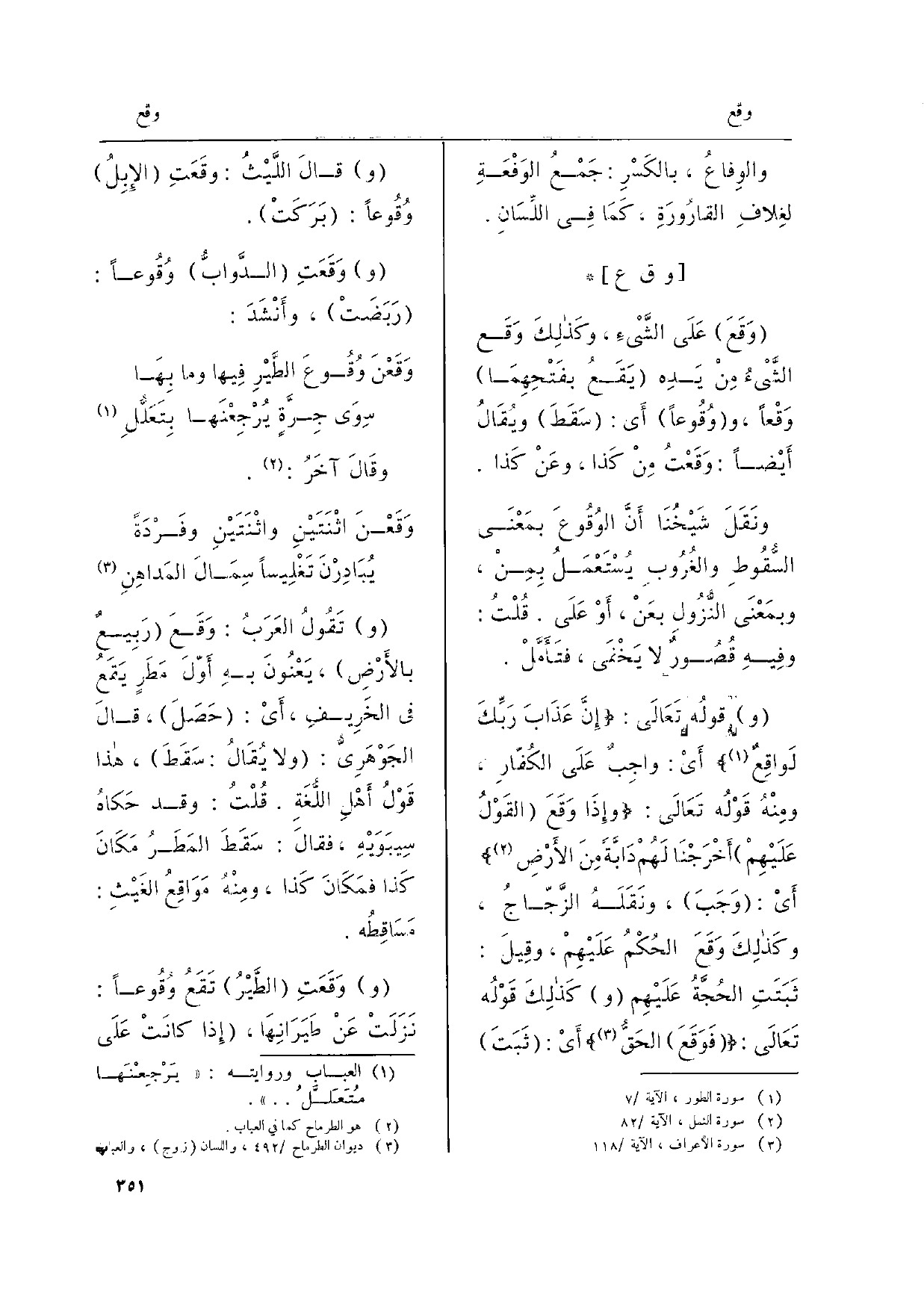 وقولُه تَعَالَى: إنَّ عَذابَ رَبِّكَ {لواقِعٌ، أَي: واجِبٌ على الكُفّارِ، ومِنْهُ قَوْلُه تَعَالَى: وَإِذا وَقَعَ القَوْلُ عَلَيْهِمْ أخْرَجْنَا لَهُمْ دابَّةً منَ الأرْضِ، أَي: وَجَبَ، ونَقَله الزَّجَاجُ، وكذلكَ وَقَعَ الحُكْمُ عَلَيْهِمْ وقيلَ: ثَبَتَتِ الحُجَّةُ عَلَيْهِم وكذلكَ قَوْلُه تَعَالَى:} فَوَقَعَ الحَقُّ أَي: ثَبَتَ وقالَ اللَّيْثُ: {وقَعَتِ الإبِلُ} وُقُوعاً: بَرَكَتْ.