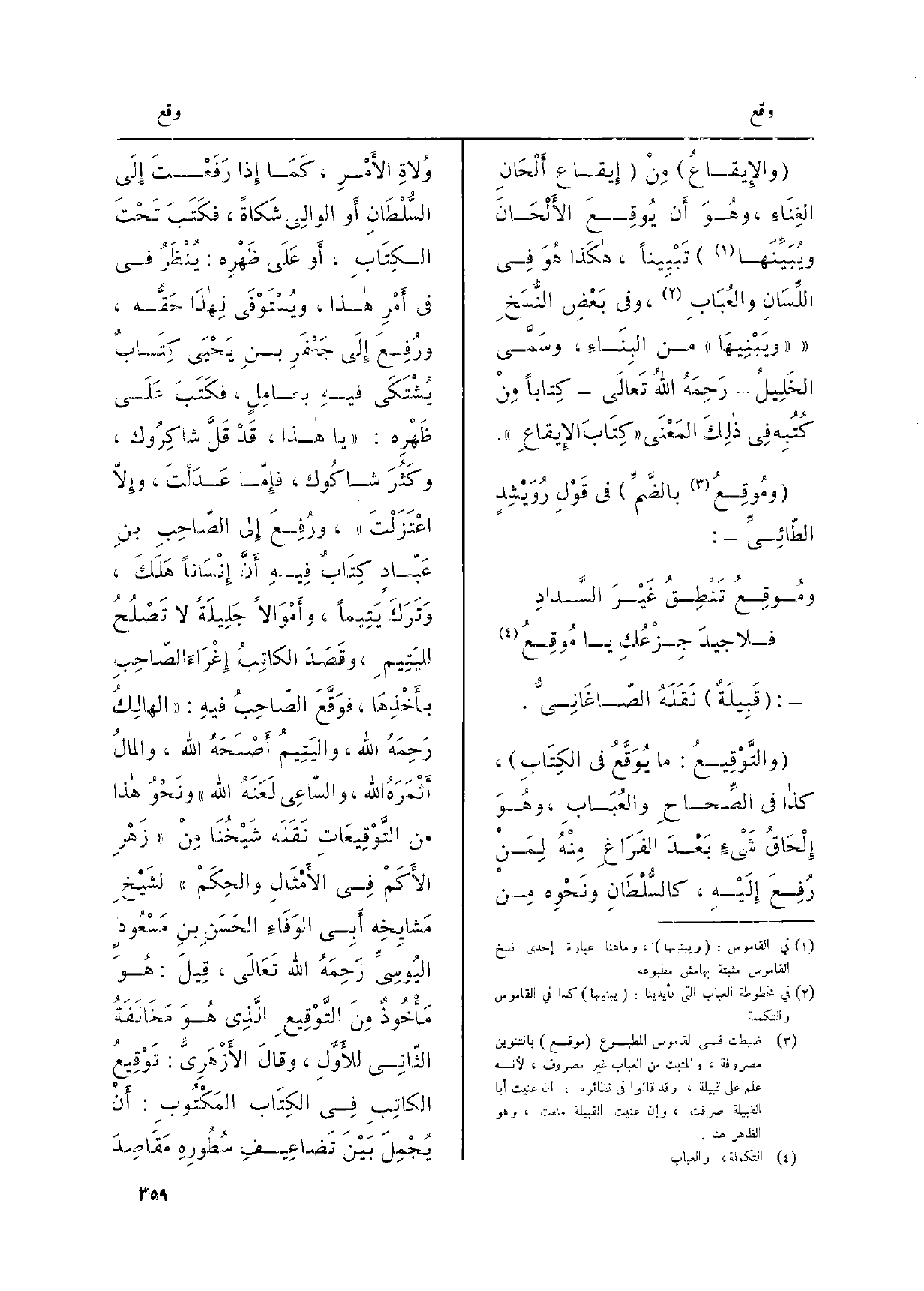 } والتَّوْقِيعُ: مَا {يُوَقَّعُ فِي الكتابِ، كَذَا فِي الصِّحاحِ والعُبابِ، وهوَ إلْحَاقُ شَيءٍ بعْدَ الفَرَاغِ منْهُ لمَنْ رُفِعَ إليْهِ، كالسُّلطانِ ونَحْوه منْ وُلاةِ الأمْرِ، كَمَا إِذا رَفْعَتَ إِلَى السّلْطَانِ أَو الْوَالِي شَكاةً، فكتَبَ تحتَ الكِتابِ، أَو على ظَهْرِه: يُنْظَرُ فِي أمْرِ هَذَا، ويُسْتَوْفَى لهَذَا حَقُّه، ورُفِعَ إِلَى جَعْفَرِ بنِ يَحْيَى كِتابٌ يُشْتَكَى فيهِ بعامِلٍ، فكتبَ على ظَهْرهِ: يَا هَذَا، قدْ قَلَّ شاكِرُوك، وكَثُرَ شاكُوك، فإمّا عَدَلْتَ، وَإِلَّا اعْتَزَلْتَ، ورُفِعَ إِلَى الصّاحبِ بنِ عَبّادٍ كِتابٌ فيهِ أنَّ إنْسَاناً هَلَكَ، وتَرَكَ يَتِيماً، وأمْوالاً جَلِيلَةً لَا تَصْلُحُ لليَتِيمِ، وقَصَدَ الكتِبُ إغْرَاءَ الصّاحِبِ بأخْذِهَا، فوَقَّعَ الصّاحِبُ فيهِ: الهالِكُ رَحِمَهُ الله، واليتيمُ أصْلَحَهُ الله، والمالُ أثْمَرَهُ اللهُ، والسّاعِي لَعَنَهُ الله، ونَحْوُ هَذَا من} التَّوقيعاتِ نَقَلَه شَيْخُنا منْ زوَهْرِ الأكَمْ فِي الأمْثَالِ والحِكَمْ لشَيْخِ مَشايِخِه أبي الوَفَاءِ الحَسَن بنِ مَسْعُودٍ اليُوسِيِّ رَحِمَهُ الله تَعَالَى، قيلَ: هُوَ مأْخُوذٌ منَ التَّوقِيعِ الّذِي هوَ مخالَفَةُ الثانِي للأوَّلِ، وقالَ الأزْهَرِيُّ:! تَوْقِيعُ الكاتِبِ فِي الكتابِ المَكْتُوبِ: أنْ يُجْمِلَ بَيْنَ تَضاعِيفِ سُطُورِه مَقَاصِدَ