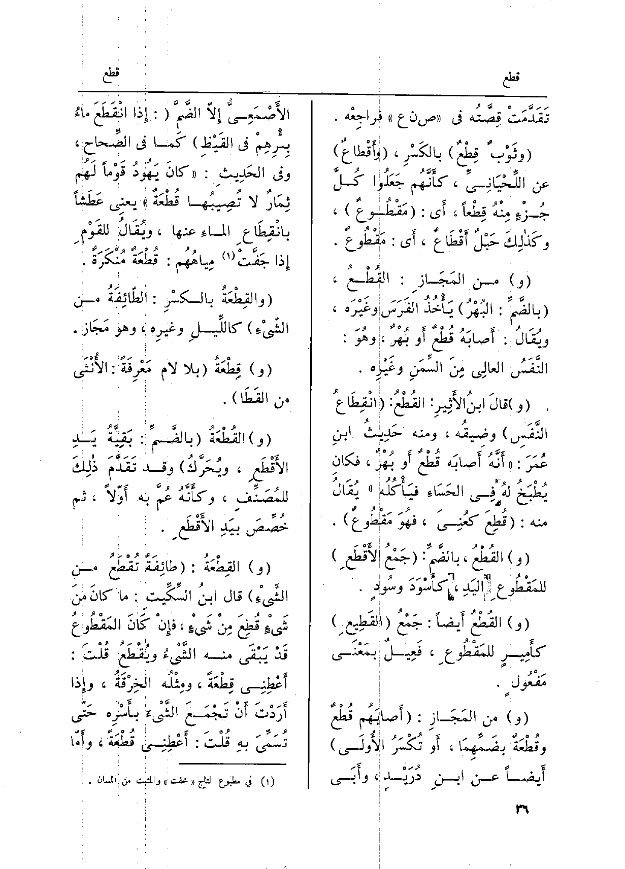 والقُطْعُ أَيْضا: جَمْعُ القَطِيعِ كأمِيرٍ للمَقْطوعِ، فَعِيلٌ بمَعْنَى مَفْعُولٍ. وَمن المَجَازِ أصابَعُم قُطْعٌ وقُطْعَةٌ بضَمِّهما، أَو تُكْسَرُ الأُولَى أَيْضا عَن ابنِ دُرَيْدٍ، وأبى الأصْمَعِيُّ إلاّ الضَّمَّ: إِذا انقَطَعَ ماءُ بِئْرِهِمْ فِي القَيْظِ كَما فِي الصِّحاحِ، وَفِي الحَدِيبُ: كانَ يَهُودُ قَوْماً لَهُم ثِمارٌ لَا تُصِيبُها قُطْعَةٌ يعنِي عَطَشاً بانْقِطَاعِ الماءِ عَنْهَا، ويُقَالُ للقَومِ إِذا جَفَّتْ مِياهُهُم: قُطْعَةُ مُنْكَرَةٌ.