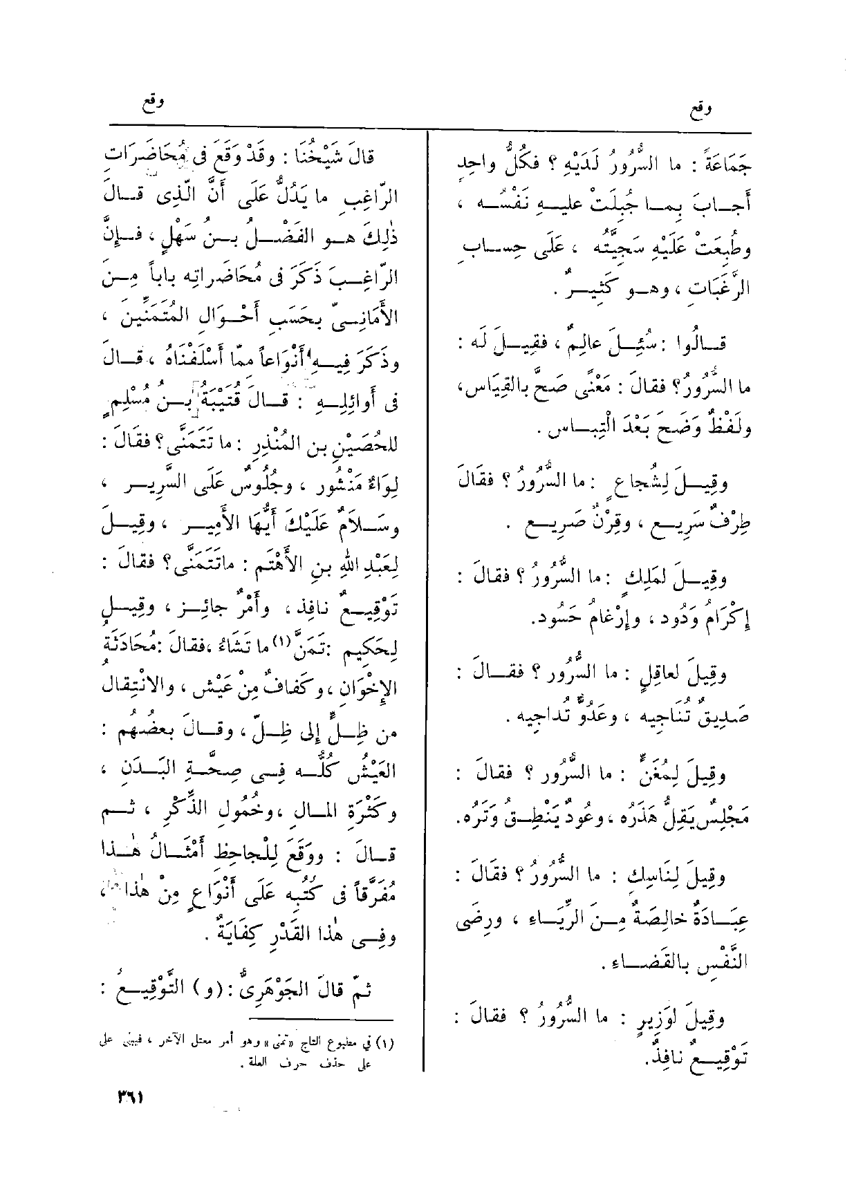 قالُوا: سُئِلَ عالِمٌ، فقيلَ لَهُ: مَا السُّرُورُ فقالَ: مَعْنىً صَحَّ بالقِياس، ولَفْظٌ وَضَحَ بَعْدَ التِباس.