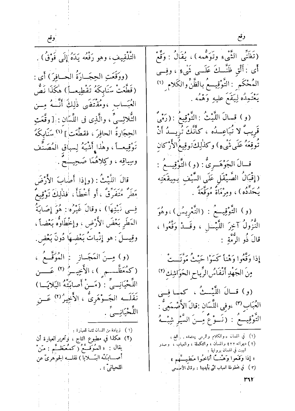 قالَ اللَّيْثُ: وَإِذا أصابَ الأرْضَ مَطَرٌ مُتَفَرِّقٌ، أَو أخْطَأَ فذلكَ} تَوْقِيعٌ فِي نَبْتِهَا، وقالَ غَيْره: هُوَ إصابَةُ المَطَرِ بَعْضَ الأرْضِ، وإخْطاؤُه بَعْضاً، وقيلَ: هُوَ إنْباتُ بَعْضِهَا دُونَ بَعْضٍ.