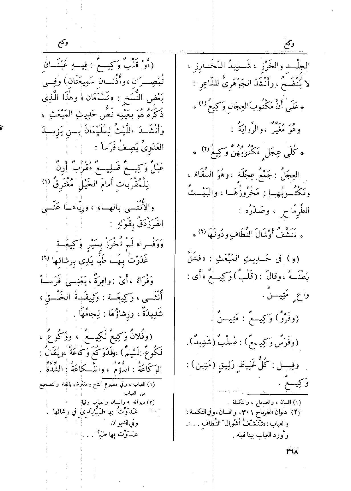 الجِلْدِ والخَرْزِ، شَدِيدُ المَخَارِزِ، لَا يَنْضَحُ، وأنْشَدَ الجَوْهَرِيُّ للشّاعِرِ: على أنَّ مَكْتُوبَ العِجَالِ وَكِيعُ وهُوَ مُغَيَّرٌ، والرِّوايَةُ: كُلَى عِجَلٍ مَكْتُوبُهُنَّ وكِيعُ العِجَلُ: جَمْعُ عِجْلَةٍ، وهُوَ السِّقَاءُ، ومَكْتُوبُها: مَخْرُوزُها، والبَيْتُ للطِّرِمّاحِ، وصَدرُه: تَنَشَّفُ أوْشَالَ النِّطَافِ ودُونَهَا وَفِي حديثِ المَبْعَثِ: فشَقَّ بَطْنَهُ، وقالَ: قَلْبٌ وكَيعٌ، أَي: واعٍ مَتِينٌ.