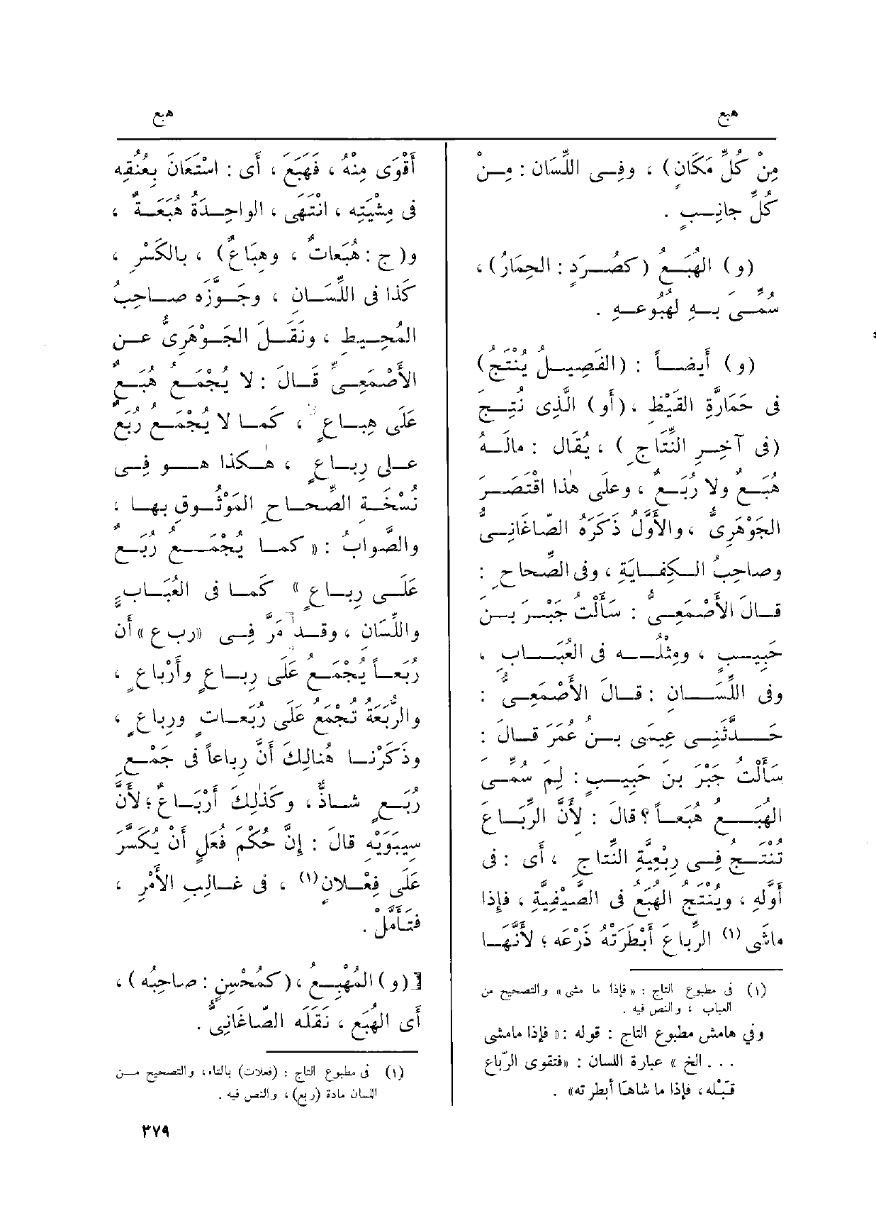 وأيْضاً: الفَصِيلُ يُنْتَجُ فِي حَمَارَّةِ القَيْظِ، أَو الّذِي نُتِجَ فِي آخِرِ النِّتَاجِ، يُقَالُ: مالَهُ هُبَعٌ وَلَا رُبَعٌ، وعَلى هَذَا اقْتَصَرَ الجَوْهَرِيُّ والأوَّلُ ذكَرَهُ الصّاغَانِيُّ وصاحِبُ الكِفايَةِ، وَفِي الصِّحاحِ: قالَ الأصْمَعِيُّ: سألتُ جَبْرَ بنَ حَبيبٍ، ومِثْلُه فِي العُبابِ، وَفِي اللِّسانِ: قالَ الأصْمَعِيُّ: حَدَّثَنِي عِيسَى بنُ عُمَرَ قالَ: سأَلْتُ جَبْرَ بنَ حَبيبٍ: لمَ سُمّيَ الهُبَعُ هُبَعاً قالَ: لأنَّ الرِّبَاعَ تُنْتَجُ فِي رِبْعِيَّةِ النِّتاج، أَي: فِي أوّلهِ، ويُنْتَجُ الهُبَعُ فِي الصَّيْفِيَّةِ، فَإِذا ماشَى الرِّباعَ أبْطَرَتْهُ ذَرْعَه، لأنَّهَا أقْوَى منْهُ، فهَبَعَ، أَي: استَعَانَ بعُنُقِه فِي مِشْيَتِه، انْتَهَى، الواحِدَةُ هُبَعَةٌ، وَج: هُبَعاتٌ، وهِبَاعٌ، بالكَسْرِ، كَذَا فِي اللِّسَانِ، وجَوَّزَه صاحِبُ المُحِيطِ، ونَقَلَ الجَوْهَرِيُّ عَن الأصْمَعِيِّ قالَ: لَا يُجْمَعُ هُبَعٌ على هِباعٍ، كَمَا لَا يُجْمَعُ هُبَعٌ على هِباعٍ، كَمَا لَا يُجْمَعُ رُبَعٌ على رِباعٍ، هَكَذَا هُوَ فِي نُسْخَةِ الصِّحاحِ المَوثوقِ بهَا، والصَّوابُ: كَمَا يُجْمَعُ رُبَعٌ على ربِاعٍ كَمَا فِي العُبَابِ، واللِّسانِ، وَقد مَرَّ فِي ربع أنَّ رُبَعاً يُجْمَعُ على رِباعٍ وأرْبَاعٍ، والرُّبْعَةُ تُجْمَعُ على رُبعاتٍ ورِباعٍ، وذكَرْنَا هُنالِكَ أنَّ رِباعاً فِي جَمْعِ رُبَعٍ شاذٌّ، وكذلكَ أرْباعٌ، لأنَّ سيبَوَيْهِ قالَ: إنَّ حُكْمَ فُعَلٍ أنْ يُكْسَّرَ على فِعْلانٍ، فِي غالِبِ الأمْرِ، فتأمَّلْ.