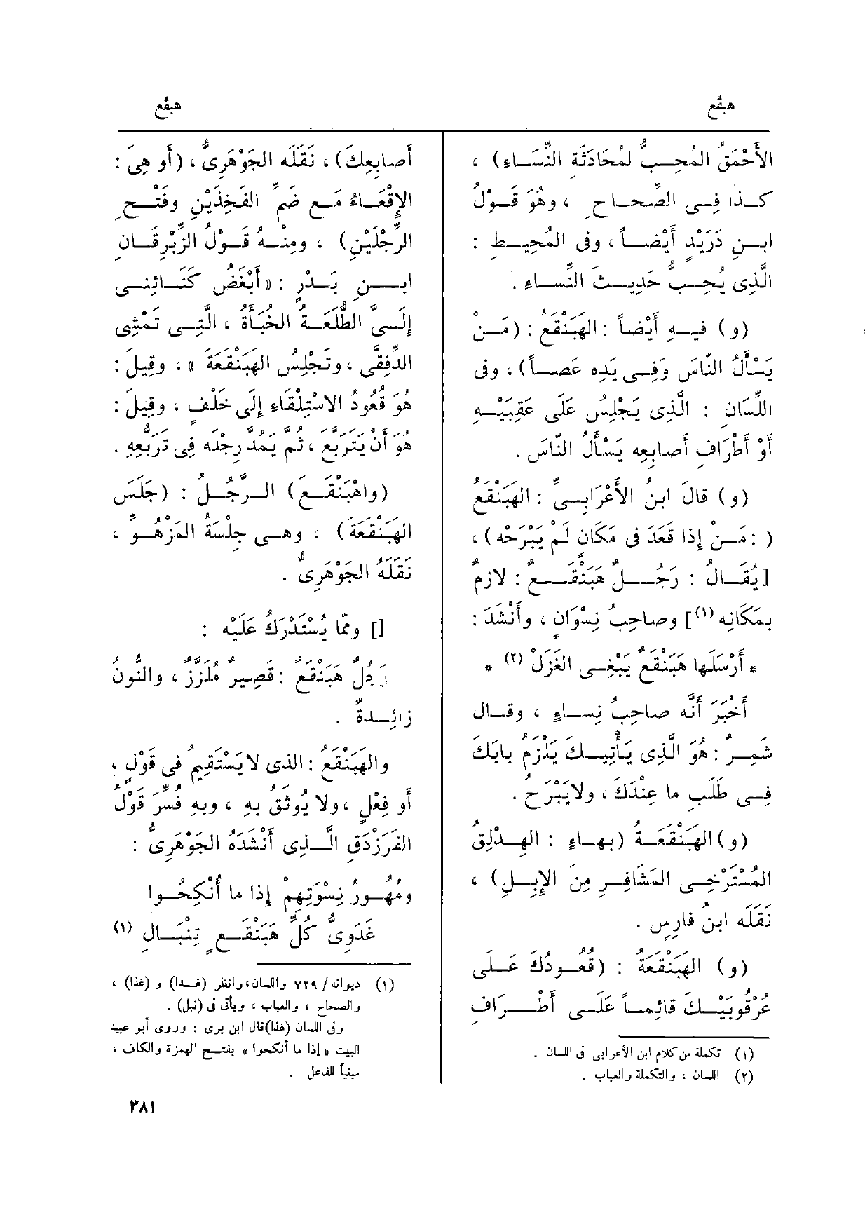 وفيهِ أيْضاً: الهَبَنْقَعُ منْ يَسأَلُ النّاسَ وَفِي يَدِهِ عَصاً، وَفِي اللِّسَانِ: الّذِي يَجْلِسُ على عَقِبَيْهِ أوْ أطْرَافِ أصابِعِه يَسْألُ النّاسَ.