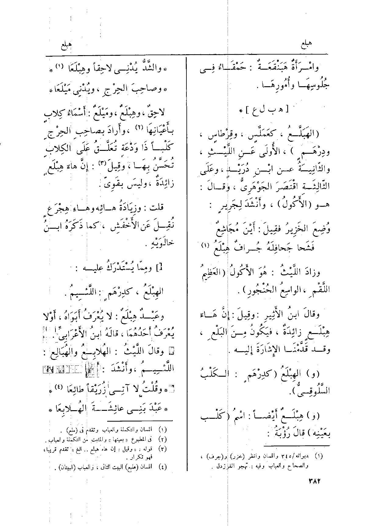 وهَبْلَعٌ أيْضاً: اسْمُ كَلْب بعَيْنِه قالَ رُؤْبَةُ: والشَّدُّ يُدْنِي لاحِقاً وهِبْلَعَا وصاحِبَ الحِرْجِ، ويُدْنِي مَيْلَعَا لاحِقٌ، وهِبْلَعٌ، ومَيْلَعٌ: أسْمَاءُ كِلابٍ بأعْيَانِهَا، وأرادَ بصاحِبِ الحِرْجِ كَلْباً ذَا وَدْعَةٍ تُعَلَّقُ على الكِلابِ تُحَسَّنُ بهَا، وقيلَ: إنَّ هاءَ هِبْلَعٍ زائِدَةٌ، وليسَ بقَويِّ.