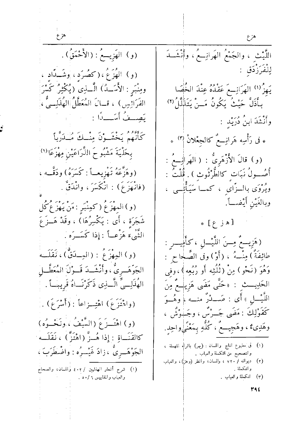 وهَزَّعَهُ تَهْزِيعاً: كسَرَهُ ودَقَّه، فانْهَزَعَ: انْكَسَرَ وانْدَقَّ.