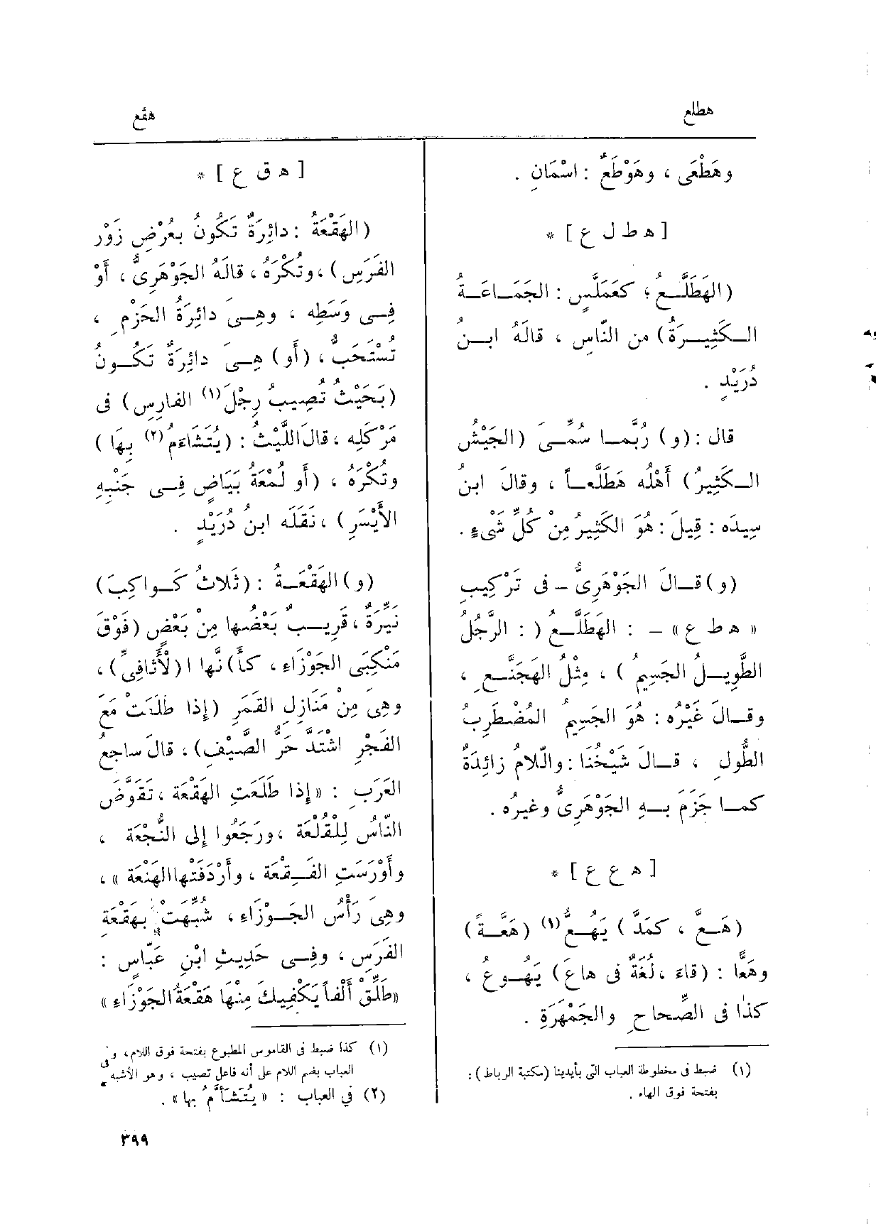 والهَقْعَةُ: ثلاثُ كَواكِبَ نَيِّرَةٌ، قَرِيبٌ بَعْضُها منْ بَعْضٍ فَوْقَ مَنْكِبَي الجَوْزَاءِ، كأنَّها لأثافِيِّ، وهِيَ منْ مَنَازِلِ القَمَرِ إِذا طلَعَتْ معَ الفَجْرِ اشْتَدَّ حَرُّ الصَّيْفِ، قالَ ساجعُ العَرَبِ: إِذا طَلَعَتِ الهَقْعَةُ، تَقَوَّضَ النّاسُ للقُلْعَةَ، ورَجَعُوا إِلَى النُّجْعَة، وأوْرَسَتِ الفَقْعَةَ، وأرْدَفَتْها الهَنْعَة، وهِيَ رَأْسُ الجَوْزاءِ، شُبِّهَتْ بهقْعَةِ الفَرَسِ، وَفِي حديثِ ابنِ عَبّاسٍ: طَلِّقْ ألْفاً يَكْفِيكَ مِنْهَا هَقْعَةُ الجَوْزَاءِ أَي: