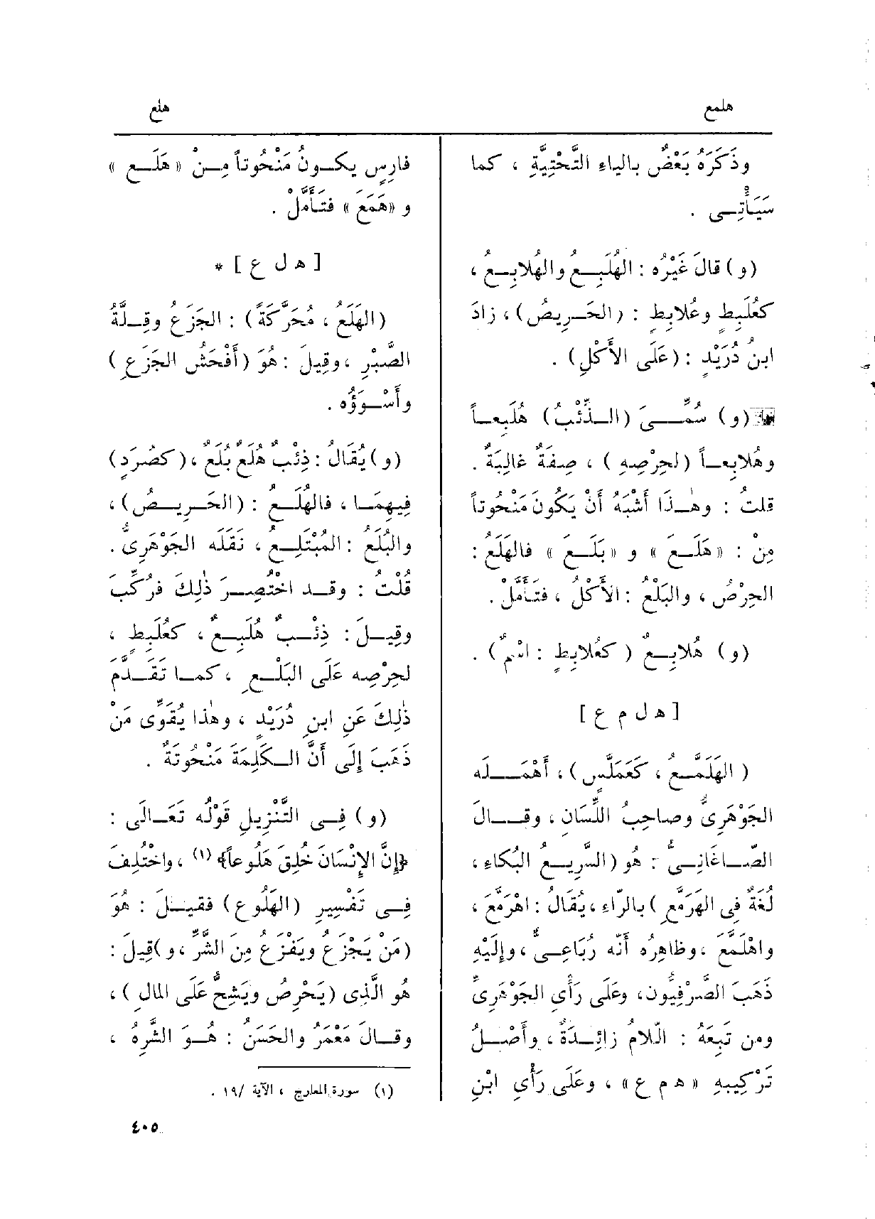 وَفِي التَّنْزِيلِ قَوْلُه تَعَالَى: إنّ الإنْسَانَ خُلِقَ هَلُوعاً، واخْتُلِفَ فِي تَفْسِيرِ الهَلُوع فقيلَ: هُوَ مَنْ يَجْزَعُ ويَفْزَعُ منَ الشَّرِّ، وقيلَ: هُوَ الّذِي يَحْرِصُ ويَشِحُّ على المالِ، وقالَ مَعْمَرُ والحَسَنُ: هُوَ الشَّرِهُ،