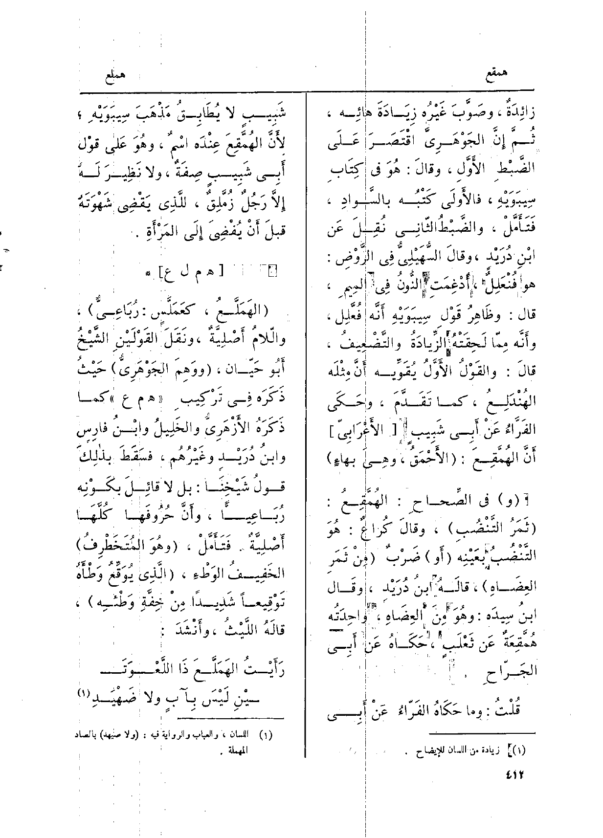 زَائِدَةٌ، وصَوَّبَ غَيْرُه زِيادَةَ هائِه، ثمَّ إنَّ الجَوْهَرِيُّ اقْتَصَرَ على الضَّبْط الأوَّلِ، وقالَ: هُوَ فِي كِتابِ سِيَبَوَيْهِ فَالْأولى كَتْبُه بالسَّوادِ، فتأمَّلْ، والضَّبْطُ الثّانِي نُقِلَ عَن ابنِ دُرَيْدٍ، وَقَالَ السُّهَيْلِيُّ فِي الرَّوْضِ: هُوَ فُنْعَلِلٌ، أُدْغِمَتِ النُّونُ فِي الميمِ، قَالَ: وظاهِرُ قَوْلِ سِيَبَوَيْهِ أنَّه فُعَّلِل، وأنَّه ممّا لَحِقَتْهُ الزِّيادَةُ والتَّضْعِيفُ، قَالَ: والقَوْلُ الأوَّلُ يُقَوِّيه أنَّ مِثْلَه الهُنْدَلِعُ، كَمَا تَقدَّمَ، وَحكى الفَرَّاءُ عَن أبي شَبيبٍ الأعْرَابِيّ أنَّ الهُمَّقعَ: الأحْمَقُ، وهِيَ بهاءٍ.