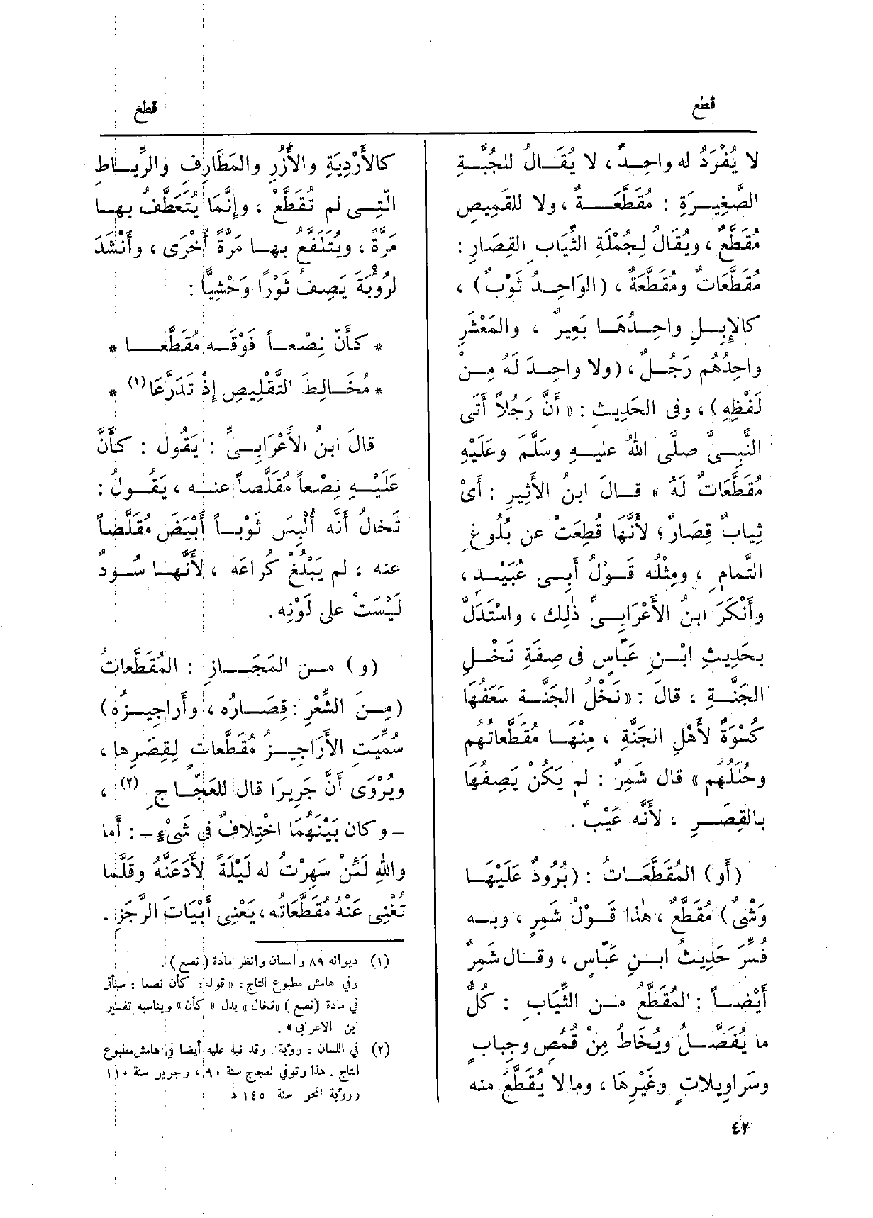 لَا يُفْرَدُ لَهُ واحِدٌ، لَا يُقَالُ للجُبَّةِ الصَّغِيرَةِ: مُقَطَّعَةٌ، وَلَا للقَمِيصِ مُقَطَّعٌ، ويُقَالُ لِجُمْلَةِ الثِّيَابِ القِصَارِ: مُقَطَّعاتٌ ومُقَطَّعَةٌ، الوَاحِدُ ثَوْبٌ، كالإبِلِ واحِدُها بَعِيرٌ، والمَعْشَرِ واحِدهُم رَجُلٌ، وَلَا واحِدَ لَهُ مِن لَفْظِه، وَفِي الحَدِيث: أنَّ رَجُلاً أَتَى النَّبِيَّ صلى الله عَلَيْهِ وَسلم وعَلَيْهِ مُقَطَّعاتٌ لهُ، قالَ ابنُ الأثِيرِ: أيْ ثِيابٌ قِصَارٌ، لأنَّهَا قُطِعَتْ عَن بُلُوغِ التَّمامِ، ومِثْلُه قَوْلُ أبي عُبَيْد، وأنْكَرَ ابنُ الأعْرَابِيِّ ذَلِك، واسْتَدَلَّ بحَدِيث ابنِ عَبّاسٍ فِي صِفَةِ نَخْلِ الجَنَّةِ، قالَ: نَخْلُ الجَنَّةِ سَعَفُهَا كُسْوَةٌ لأهْلِ الجَنَّةِ، مِنْهَا) مُقَطَّعاتُهُم وحُلَلُهم قَالَ شَمِرٌ: لم يكُنْ يَصِفُها بالقِصَرِ، لأنَّه عَيْبٌ.