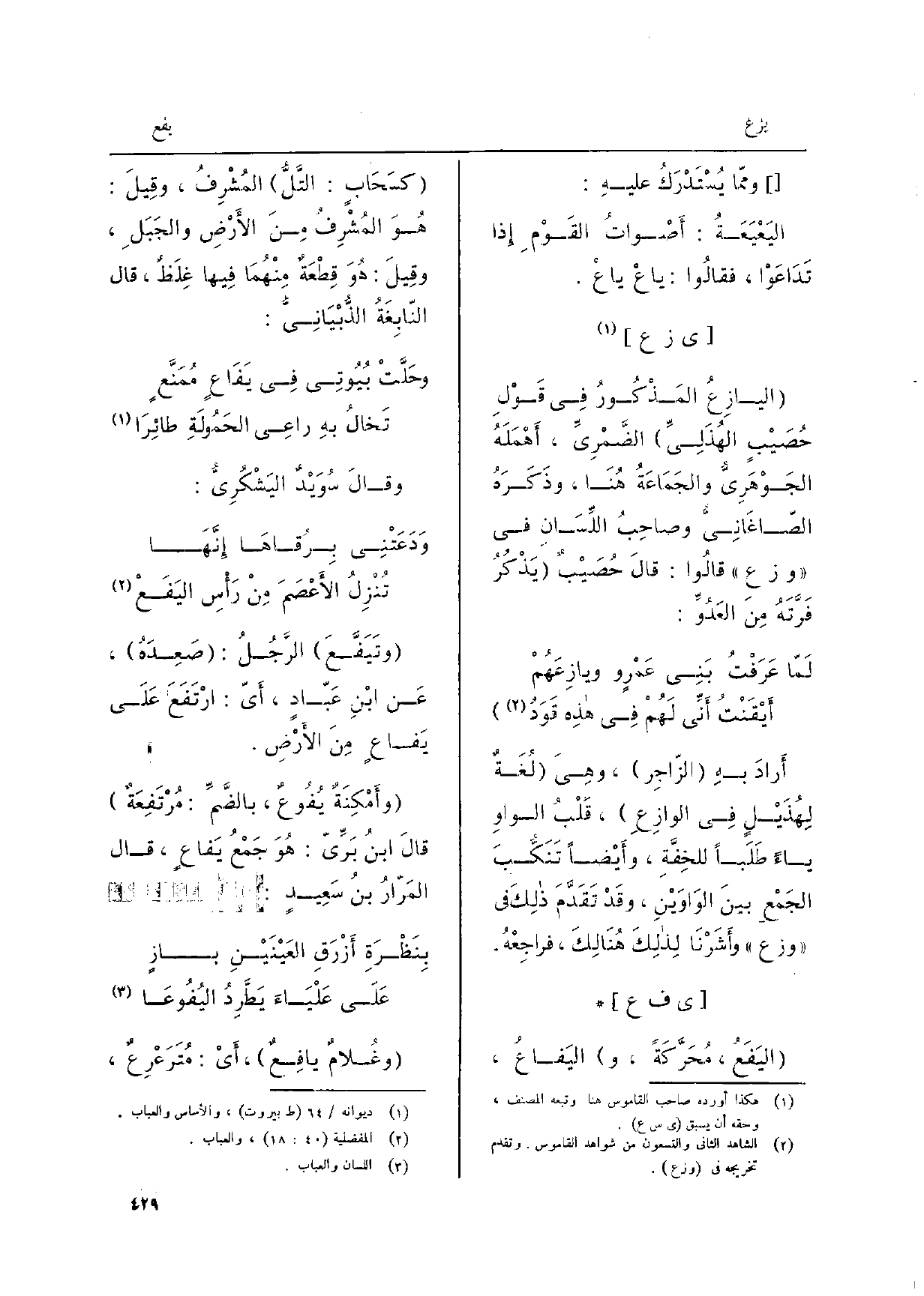 وأمْكِنَةٌ {يُفُوعٌ، بالضَّمِّ: مُرْتَفِعَةٌ قالَ ابنُ بَرِّي: هُوَ جَمْعُ} يَفاعٍ، قَالَ المَرّارُ بنُ سَعِيدٍ:
