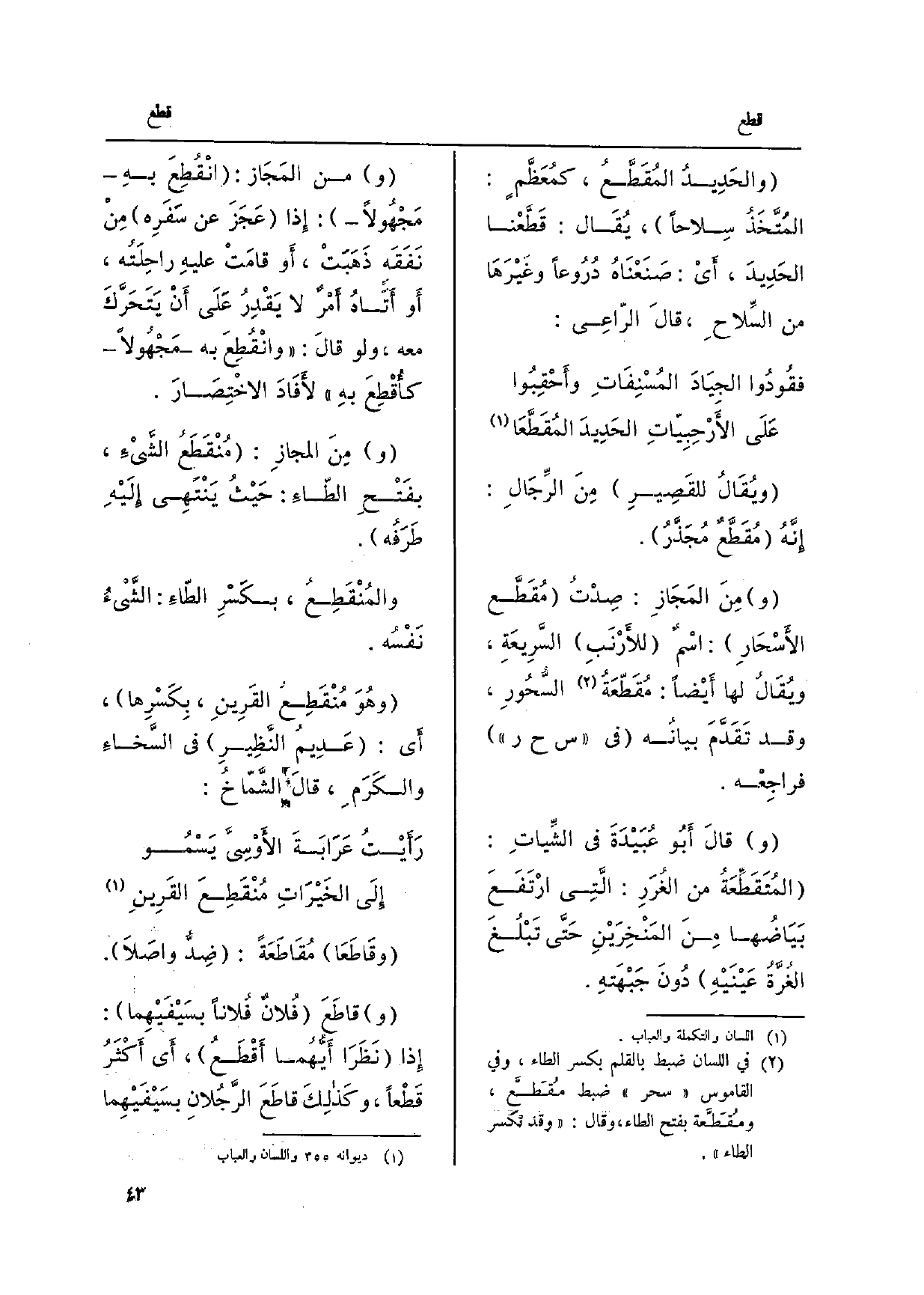 وقاطَعَ فُلانٌ فُلاناً بسَيْفَيْهِما: إِذا نَظَرا أيُّهُما أقْطَعُ، أَي أكْثَرُ قَطْعاً، وكذلِكَ قاطَعَ الرَّجُلانِ بسَيْفهِما