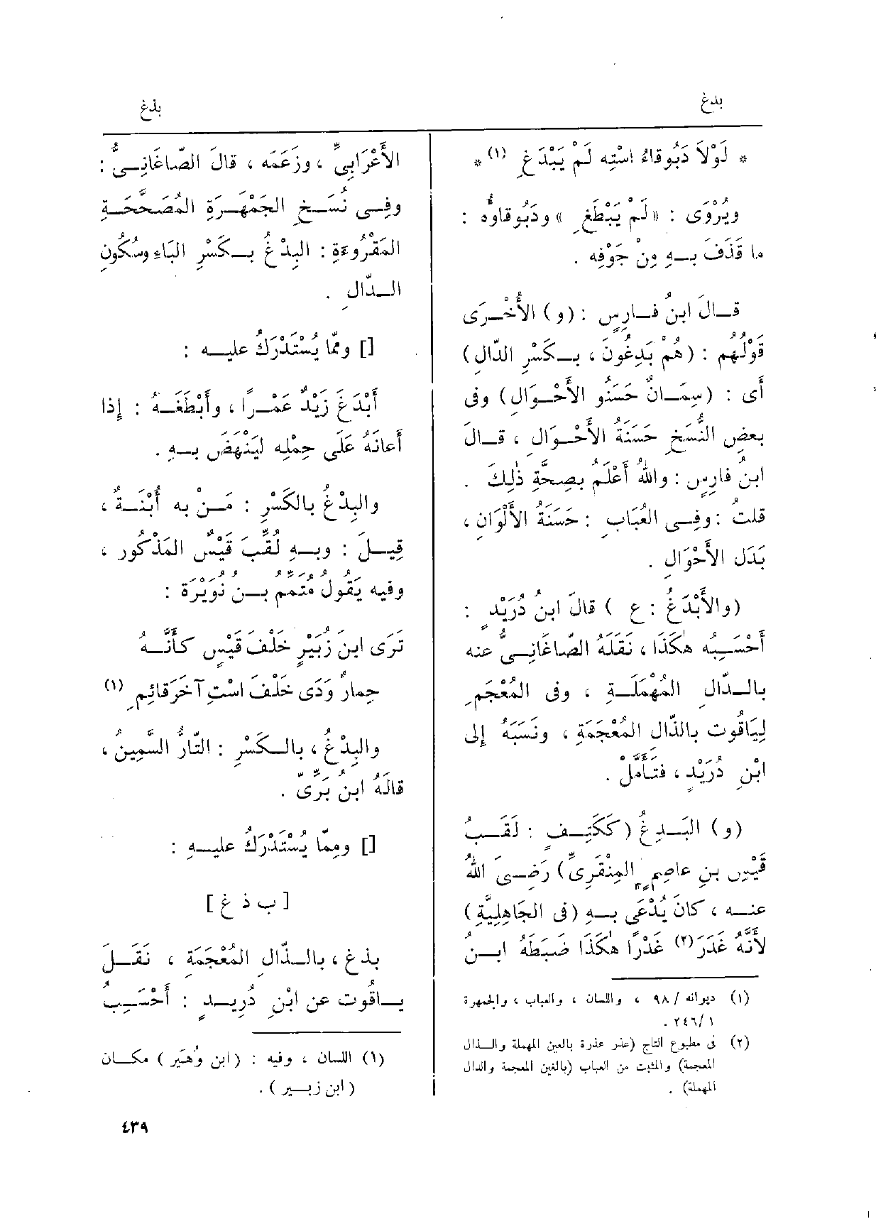 قالَ ابنُ فارِسٍ: والأُخْرَى قَوْلُهُم: هُمْ بَدِغُونَ، بكَسْرِ الدّالِ أَي: سِمَانٌ حَسَنُو الأحْوالِ وَفِي بعض النُّسَخِ حَسَنَةُ الأحْوَالِ، قالَ ابنُ فارِسٍ واللهُ أعْلَمُ بصِحَّةِ ذلكَ.