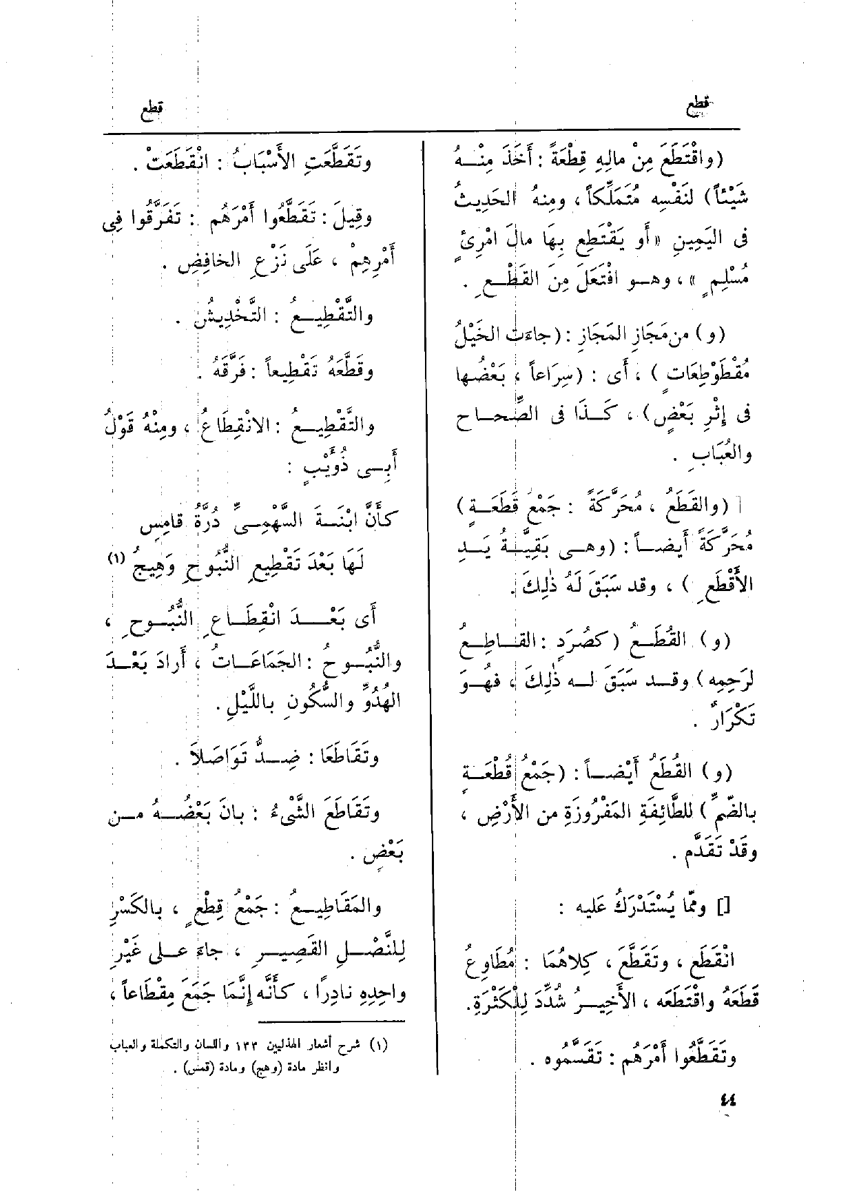 والمَقَاطِيعُ: جَمْعُ قِطْعٍ، بالكَسْرِ للنَّصْلِ القَصِيرِ، جاءَ على غَيْرِ واحِدِه نادِراً، كأنَّه إنَّمَا جَمَعَ مِقْطَاعاً،